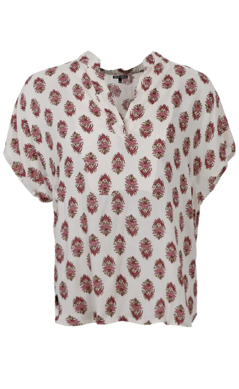 Blusen har korte ærmer og en v-hals.