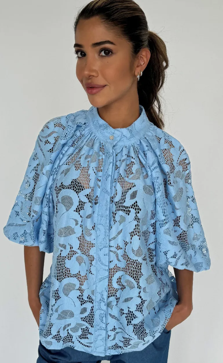 Blusen er gennemknappet og har 3/4 lange ærmer.