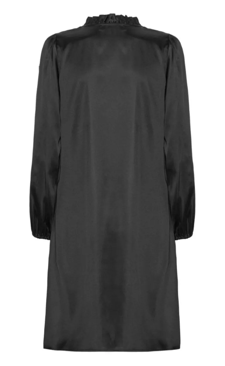 Denne kjole er sort, har ballonærmer og en frynse krave.