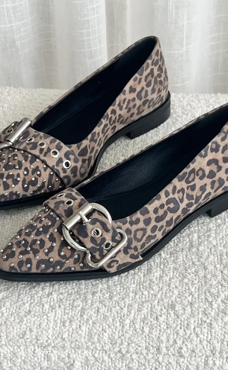 De fineste ballerinaer fra Copenhagen Shoes i leopardprint med en spænde hen over skoen.