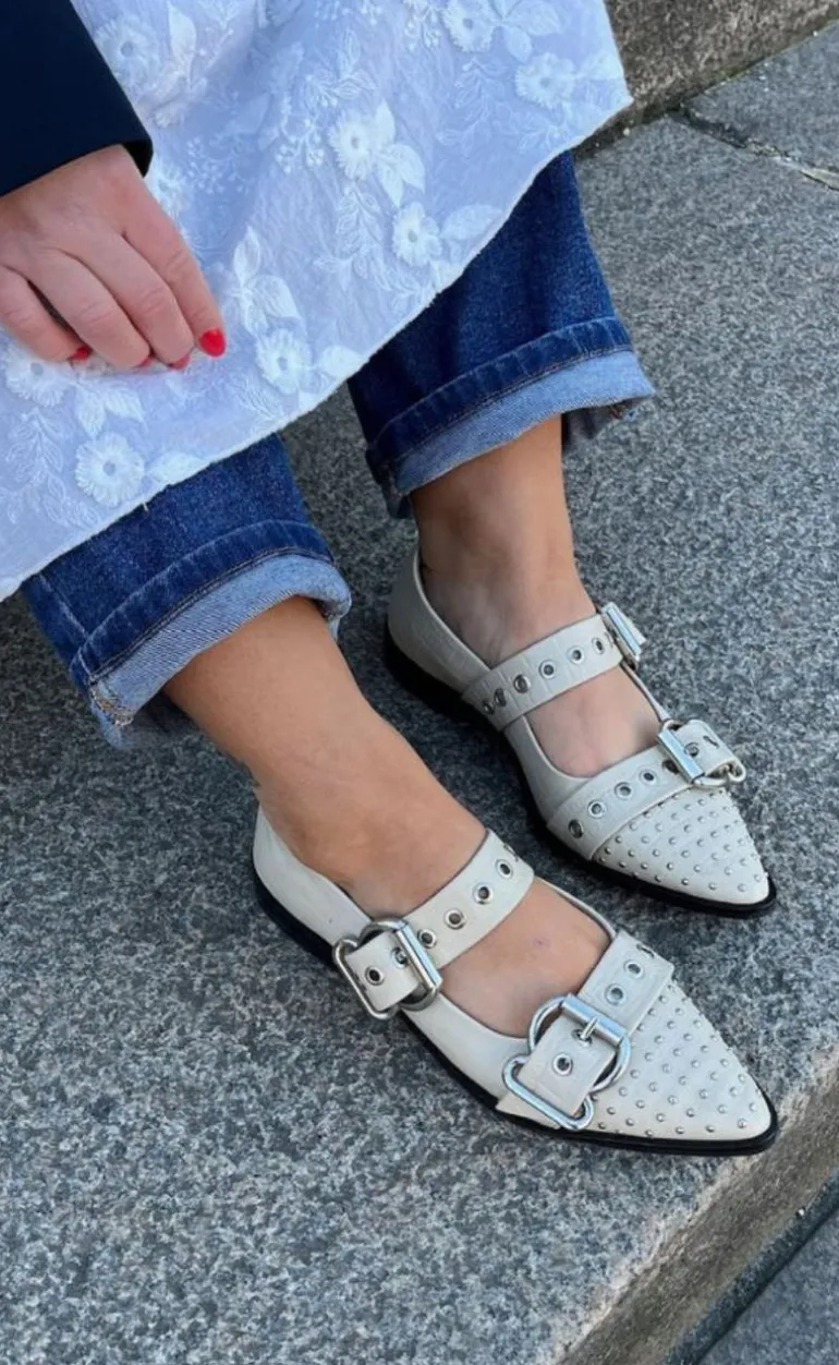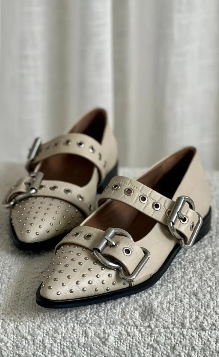 De fineste ballerinaer fra Copenhagen Shoes i beige med to spænder samt sten.