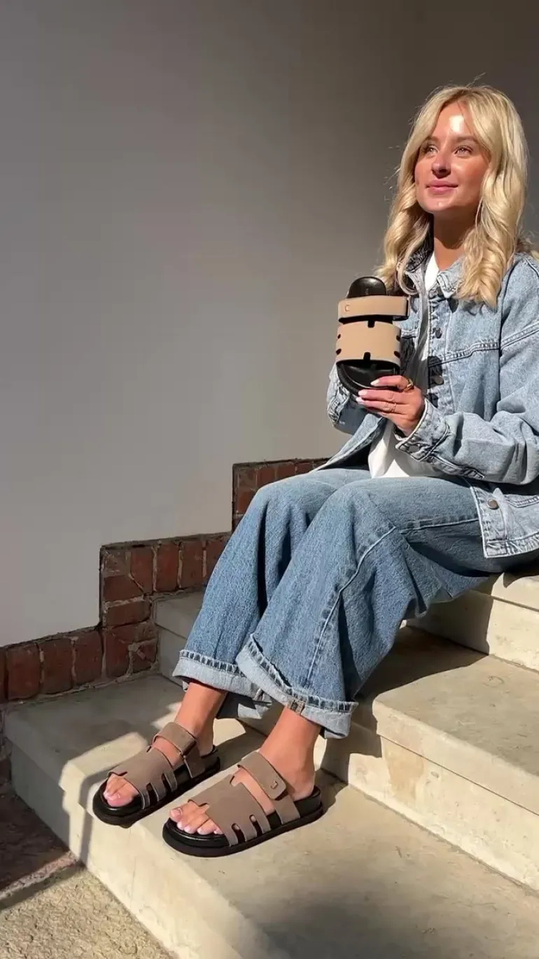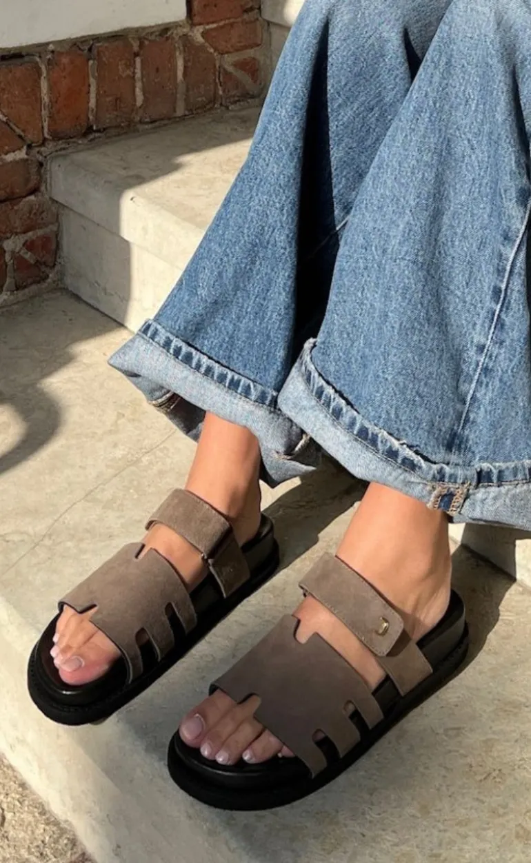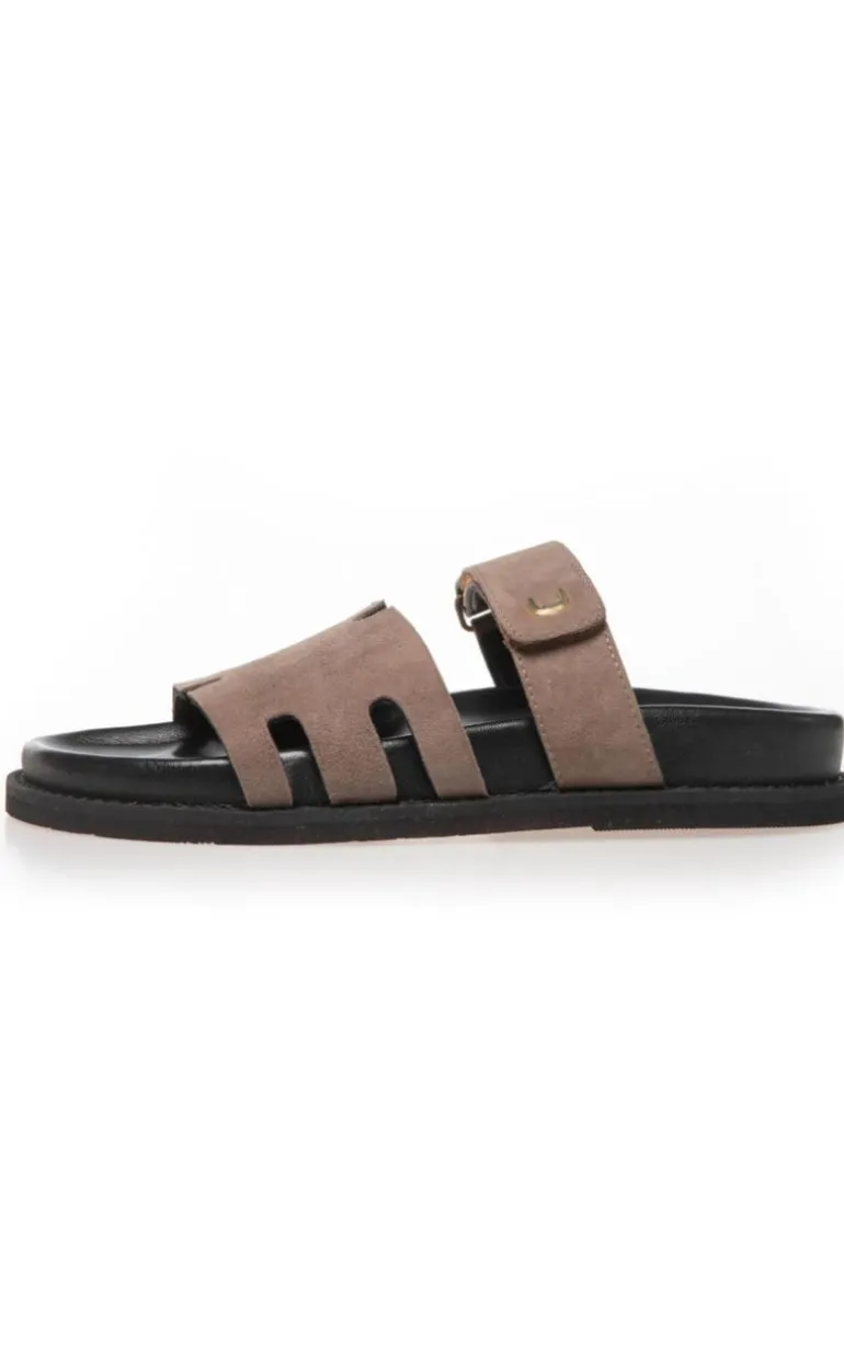 Denne sandal har en sort blød bund, og en velcro spænde for foden.