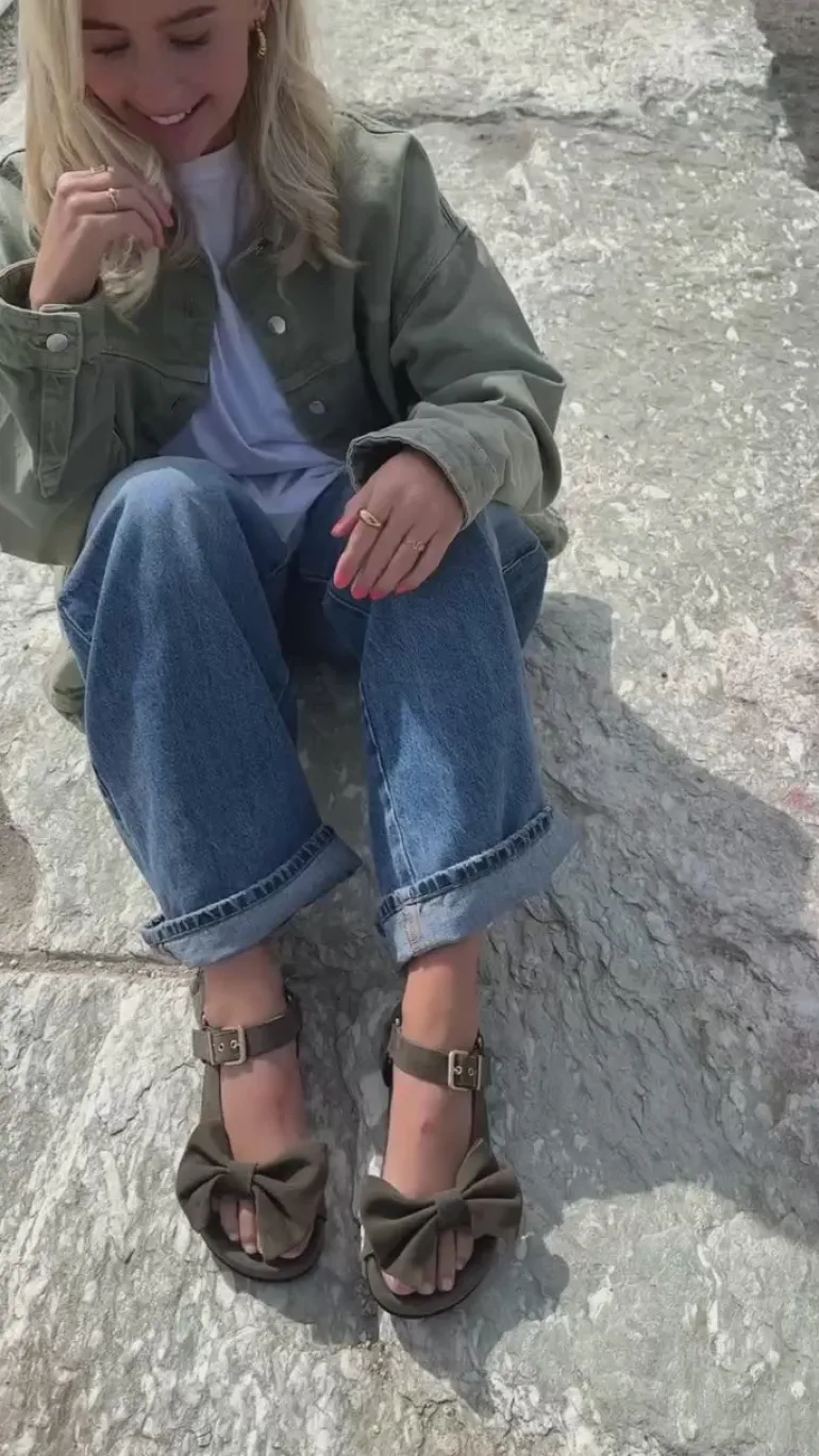 Disse sandaler har en sløjfe og spænde rundt ved anklen.