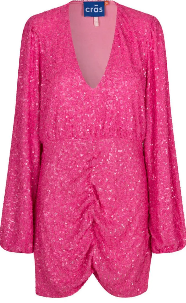 Festlig kjole fra Cras i en glitterende pink farve, med palietter.