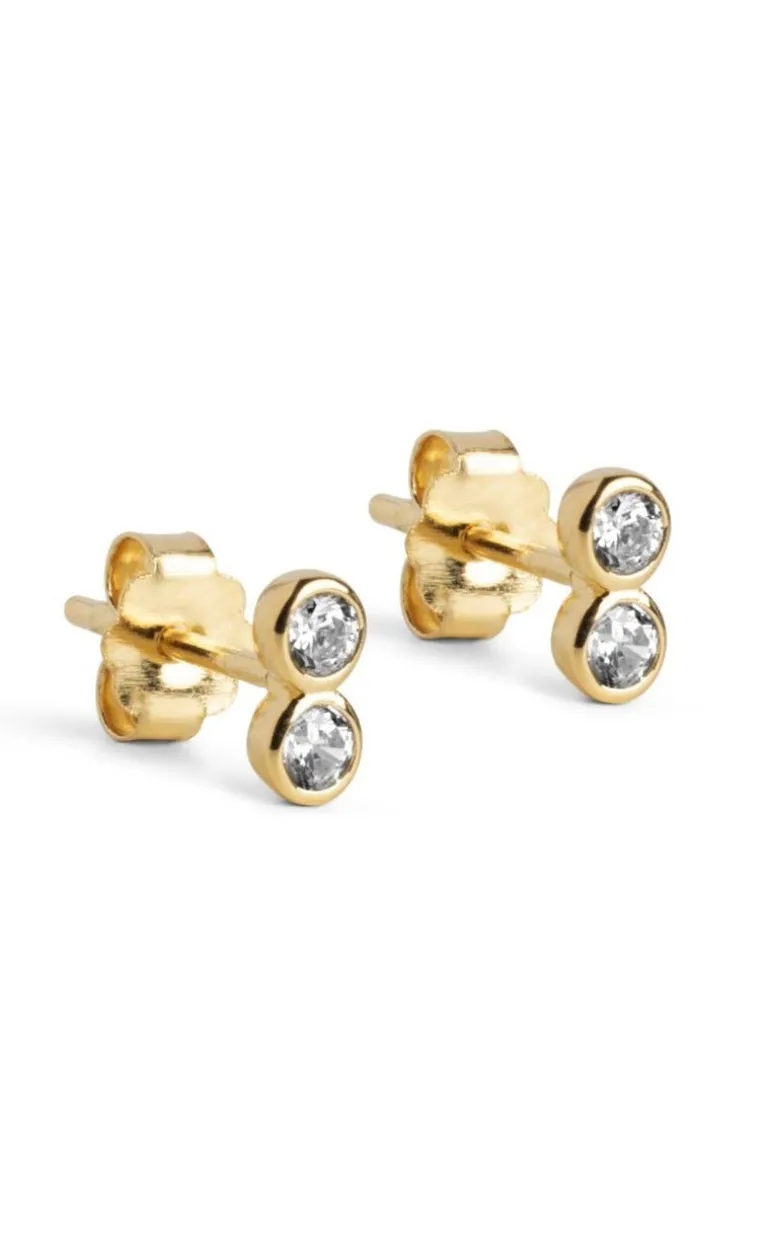 Disse søde, små twin CZ studs sætter sig som funklende stjerner på øreflippen, og er perfekte at sammensætte med alle dine andre øreringe. De består af 18 karat guldbelagt 925 sterlingsølv, og 2 klare, skinnende zirkoner.