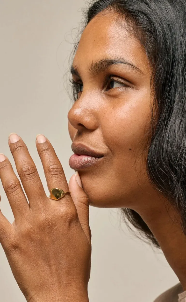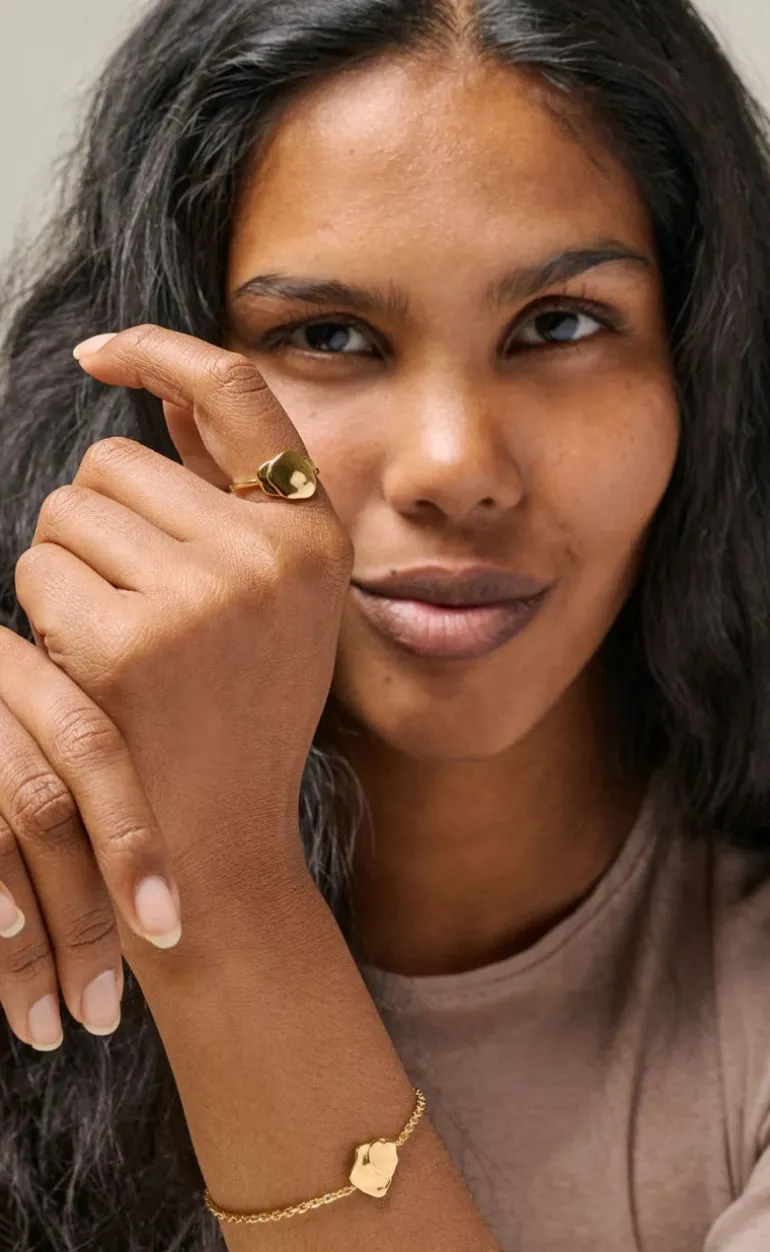 Sahara-ringen har to overlappende plader, der giver dybde og et unikt look, inspireret af ørkenens sandbanker. Den er både enkel, feminin og justerbar, og fås i to størrelser – en perfekt favoritring.