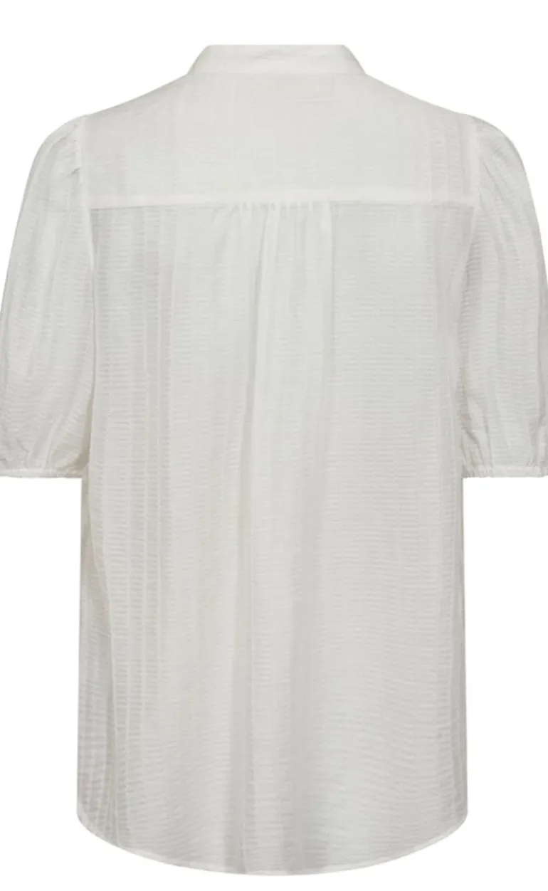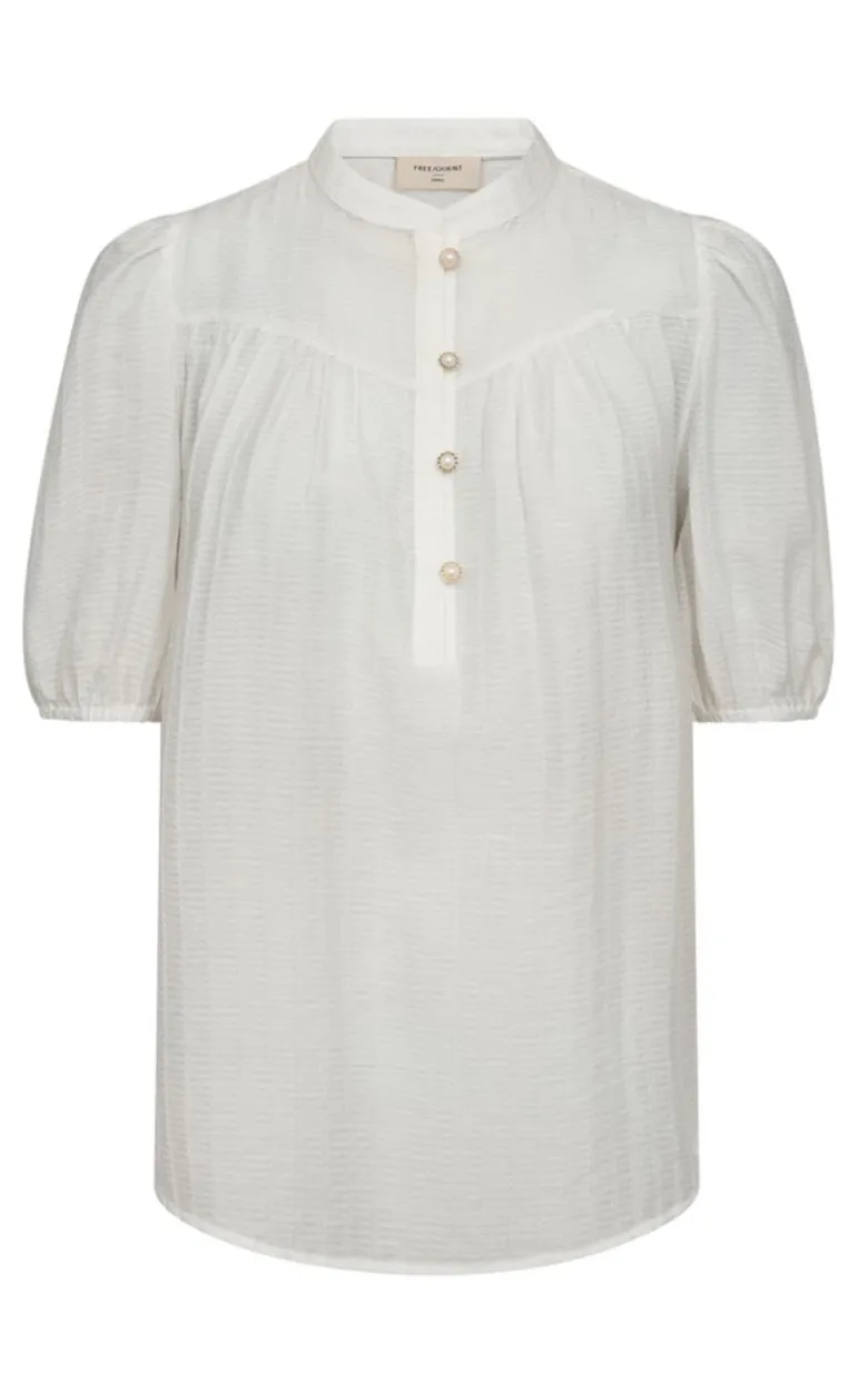 Denne bluse har korte ærmer, knapper og en kinakrave.