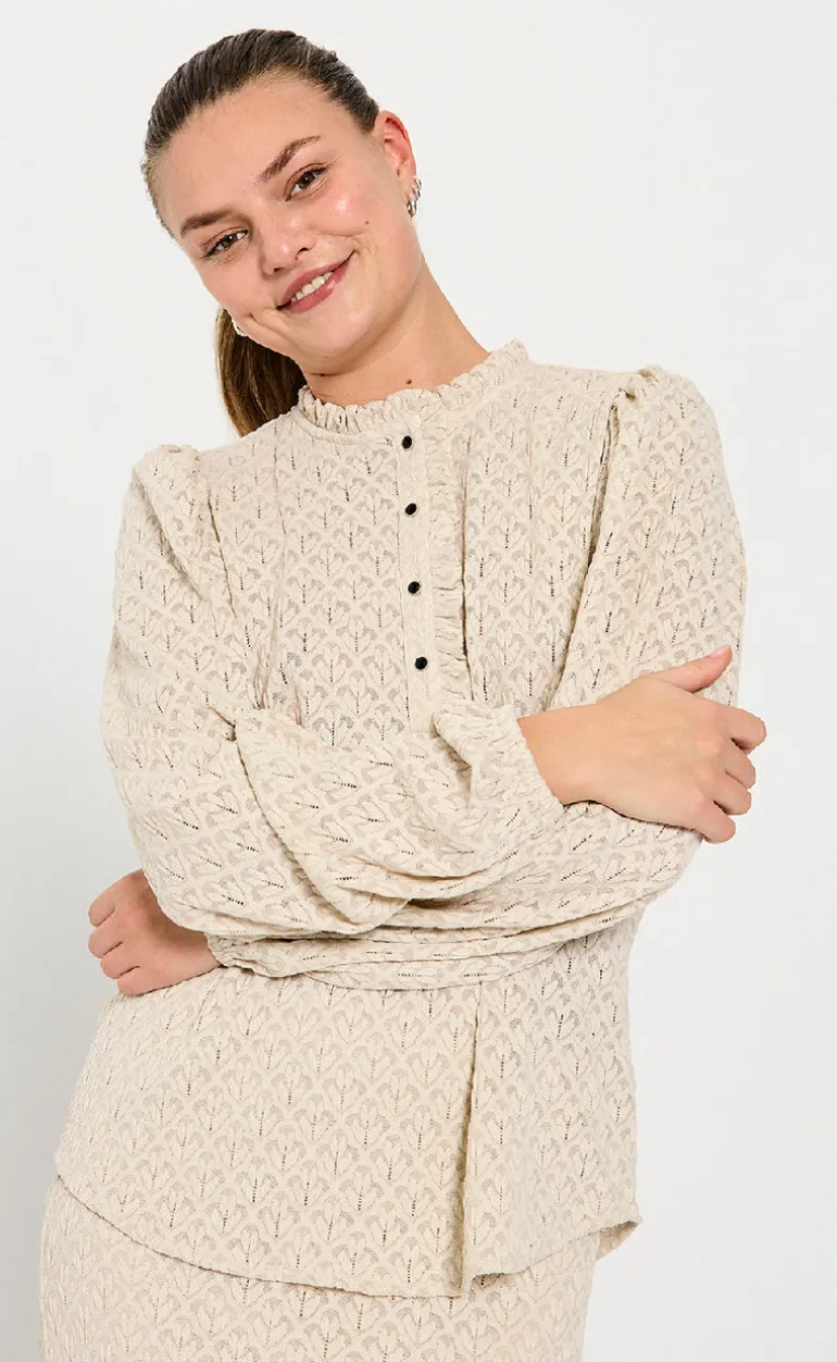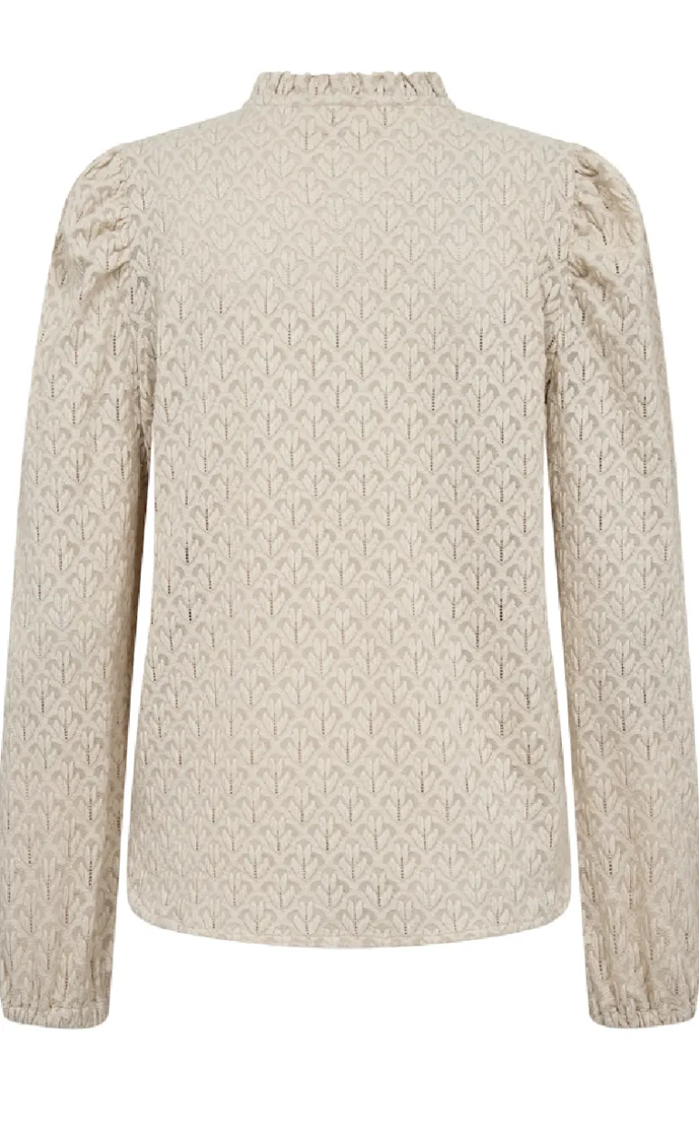 Blusen har lange ærmer, en smule puf i ærmet samt en knaplukning