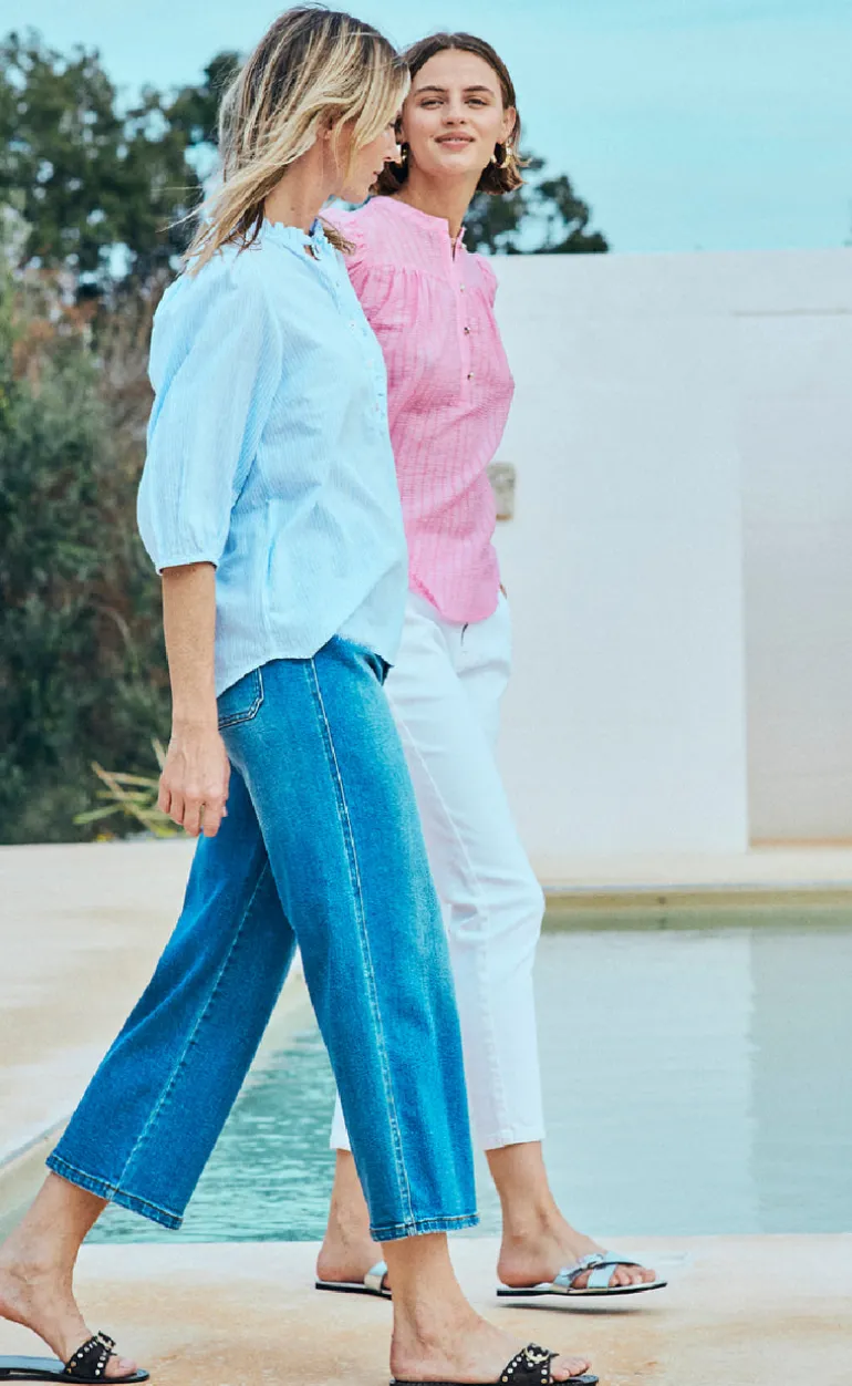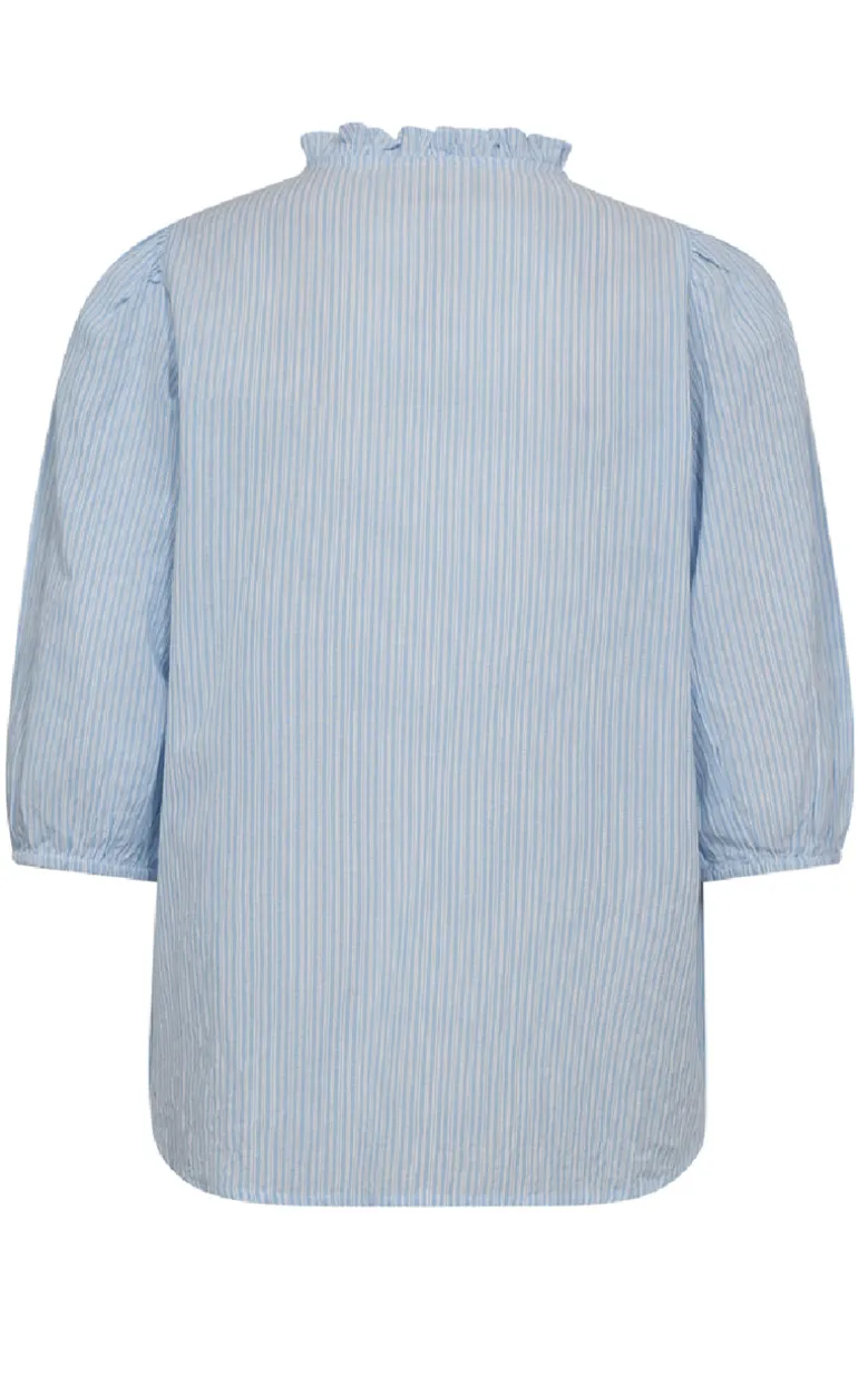 Feminin bluse fra Freequent i et blå og hvid stribet print.
