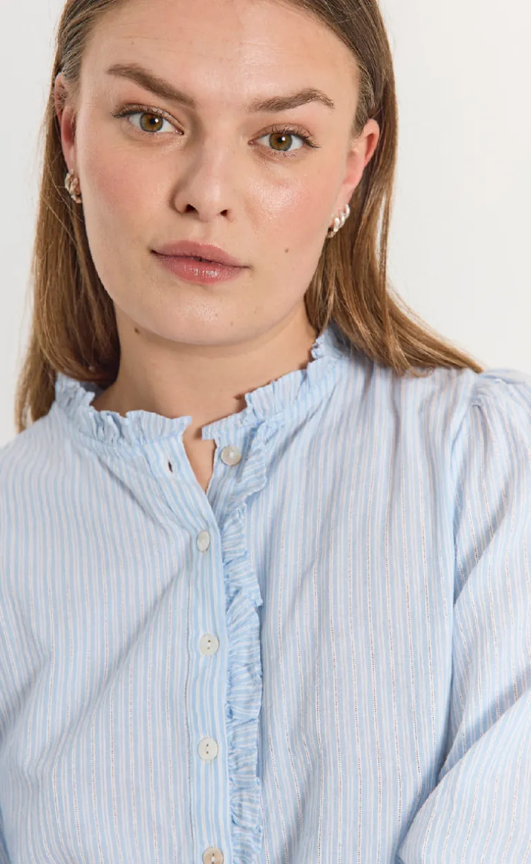 Blusen har korte ærmer samt en knaplukning med flæsekant.