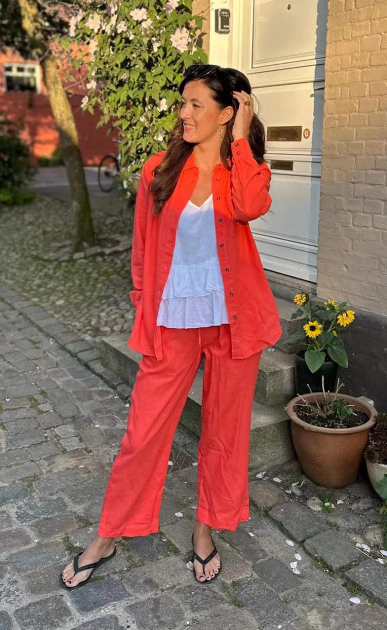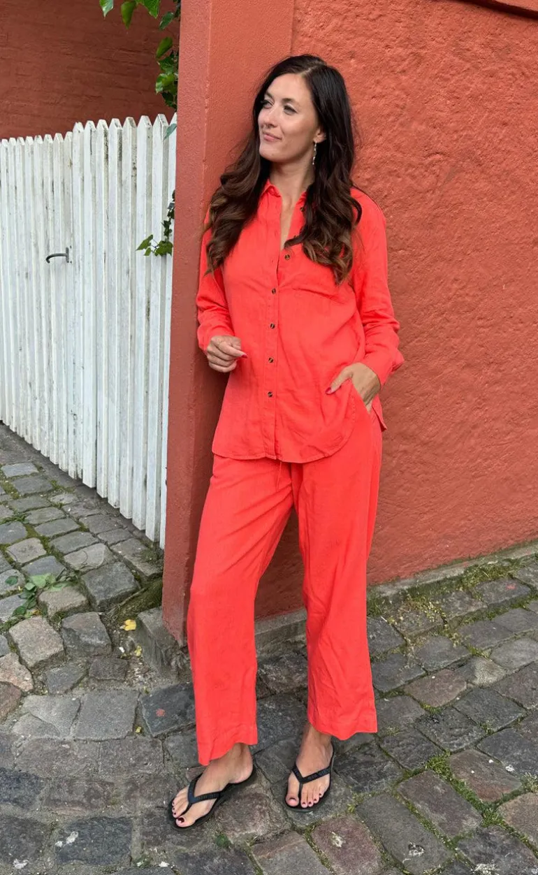 Bukserne er i hørkvalitet og har elastikkant, samt snøre i taljen.