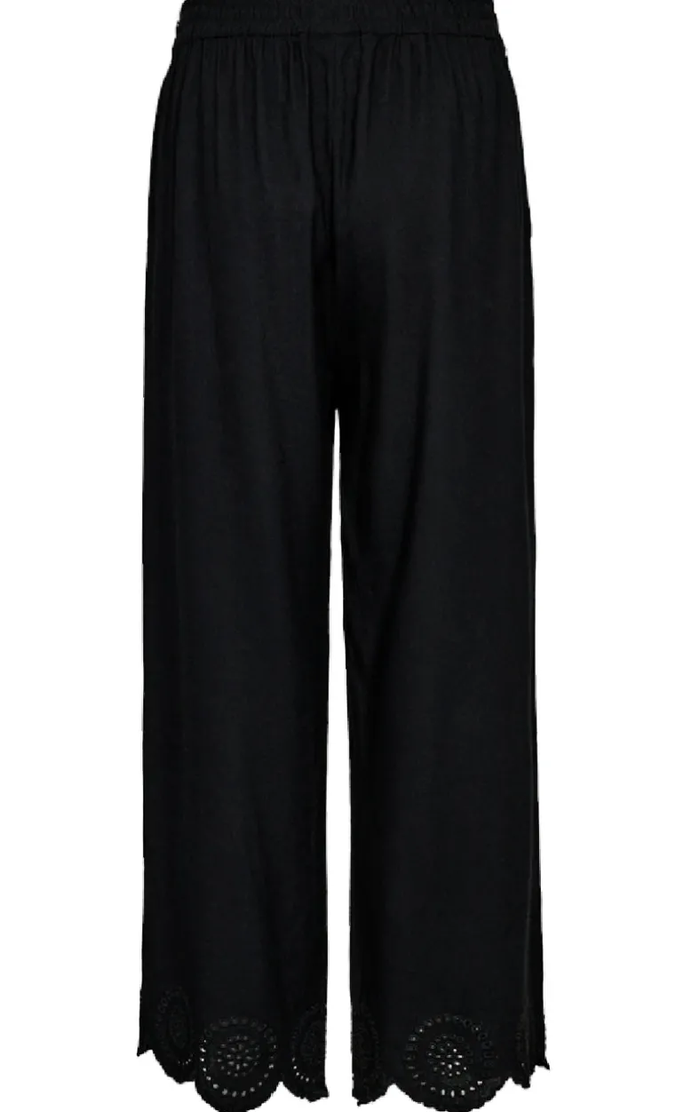 Sorte bukser fra Freequent, i et flot print som har nogle fine broderi anglaise detaljer forneden.