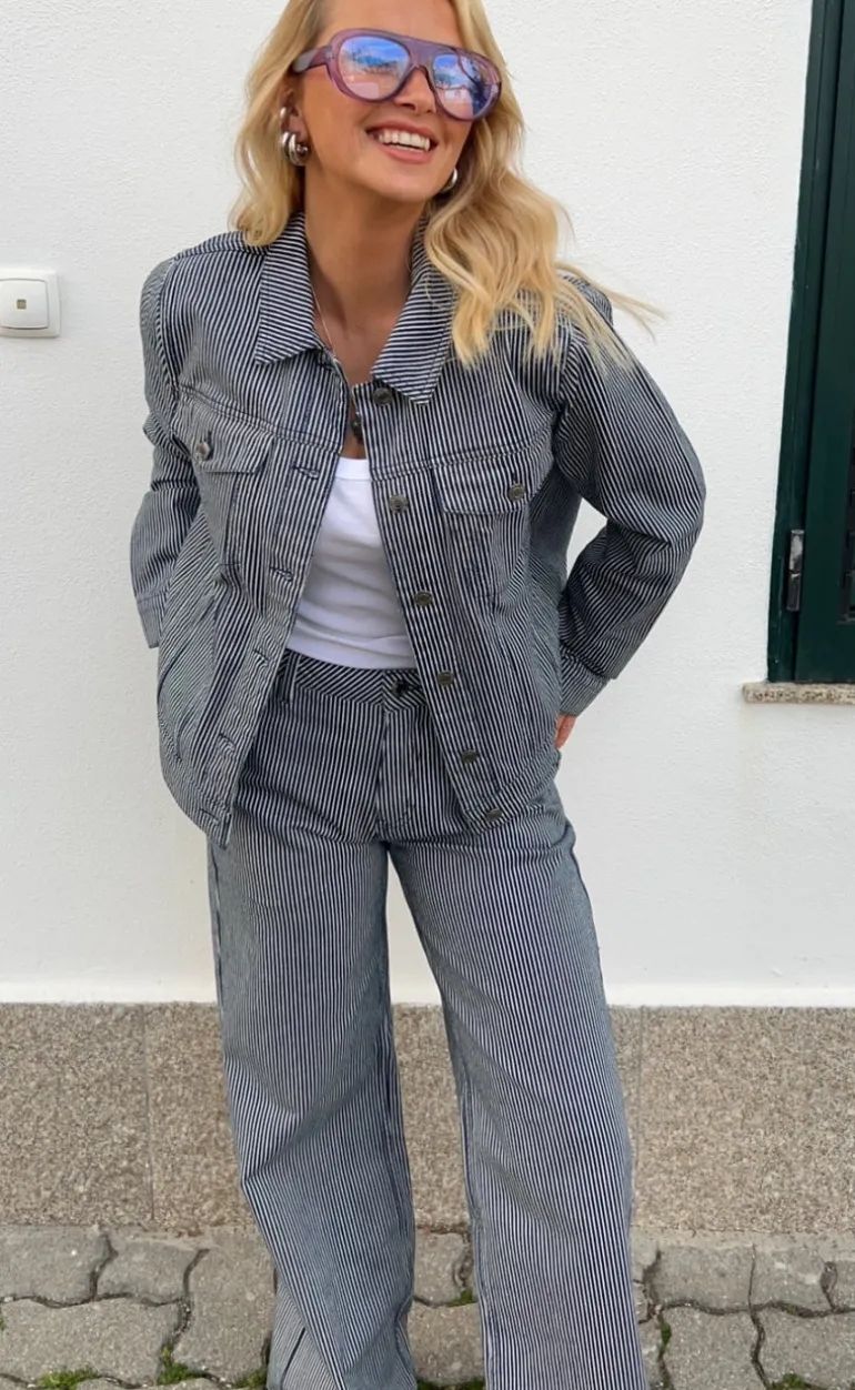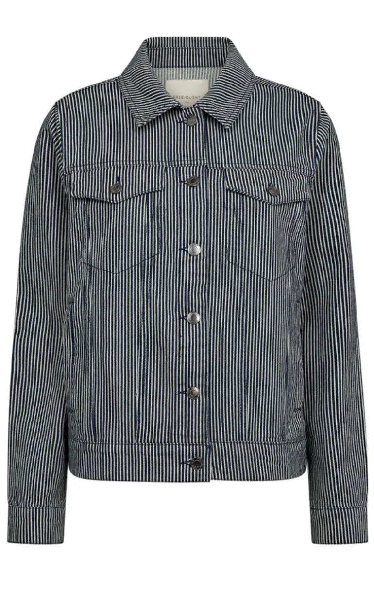 Flot denim jakke fra Freequent i et blå og hvid stribet print.