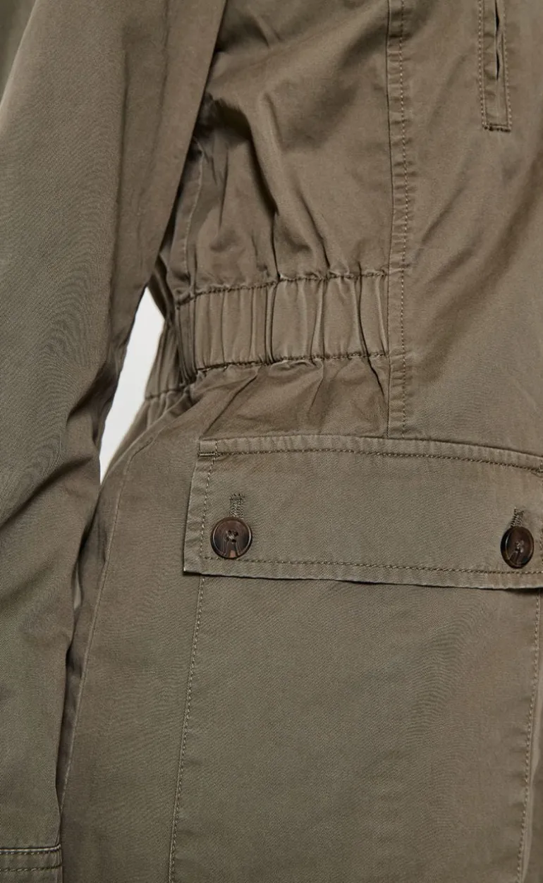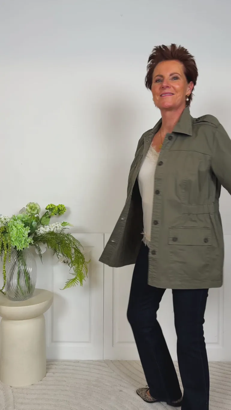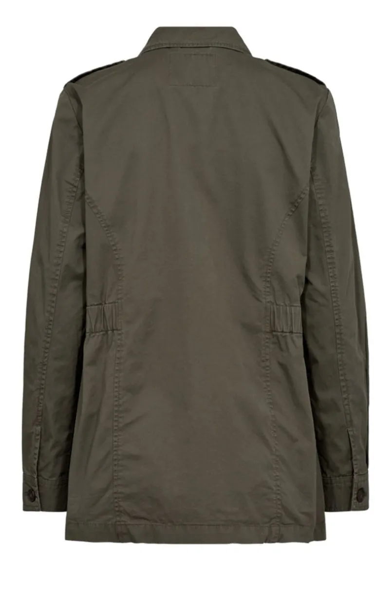 Denne jakke er i en mørk grøn farve. Har to store lommer, en krave og knapper.