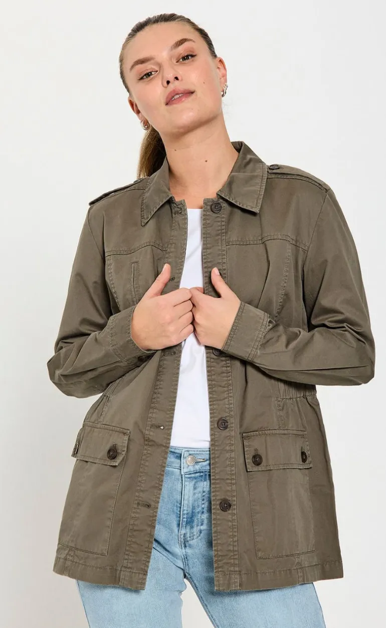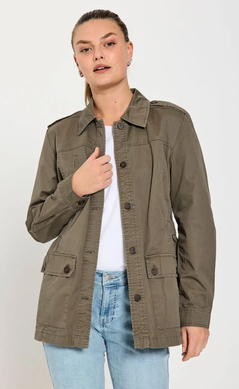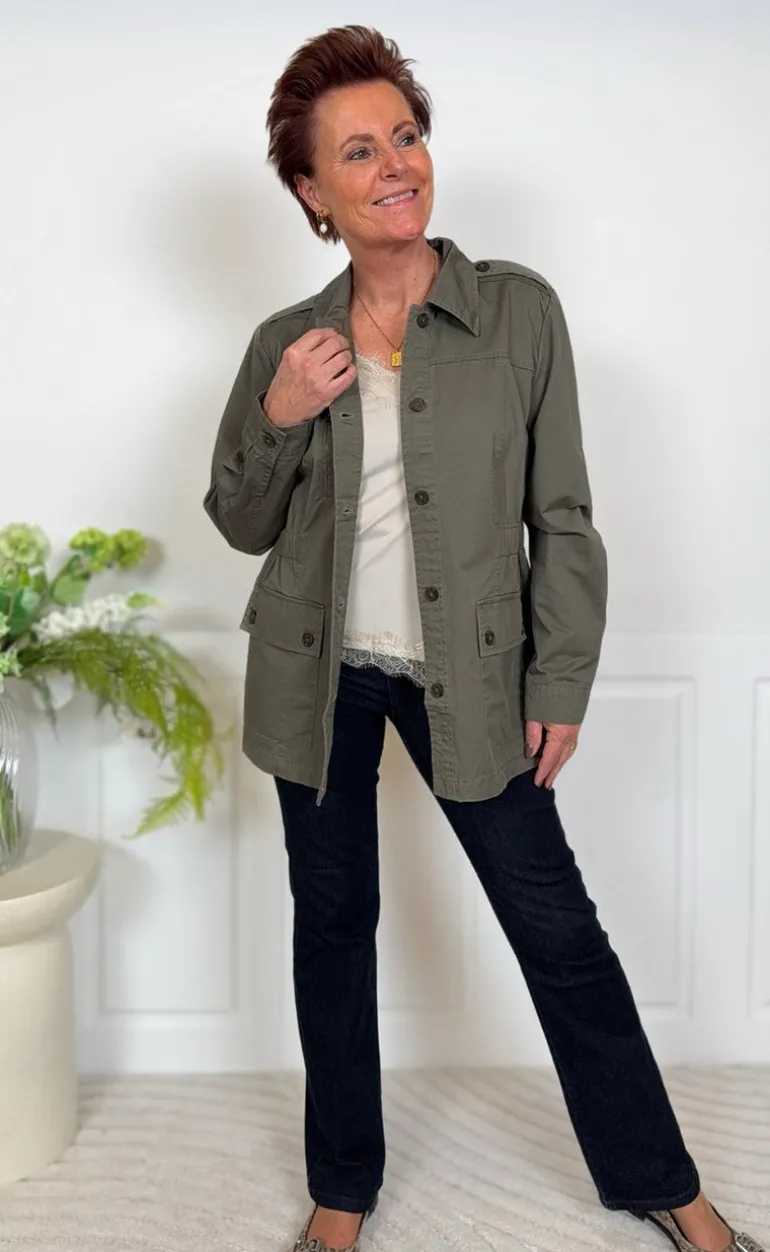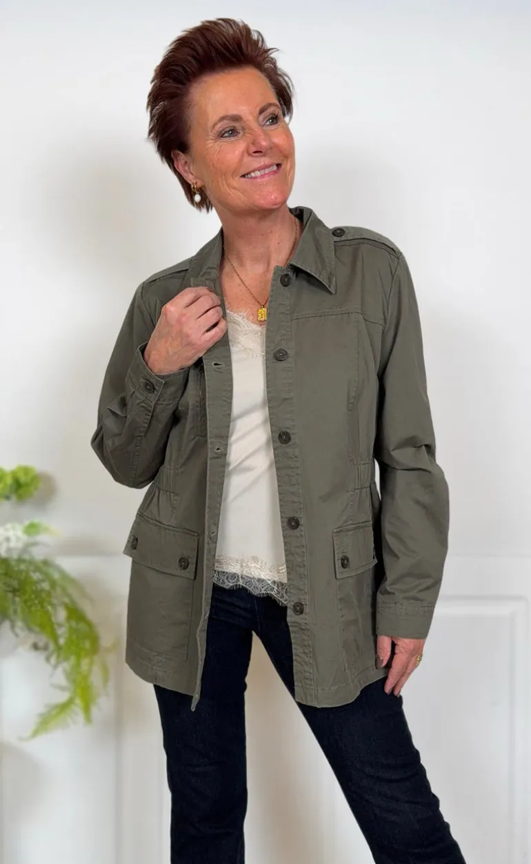Denne jakke er i en mørk grøn farve. Har to store lommer, en krave og knapper.