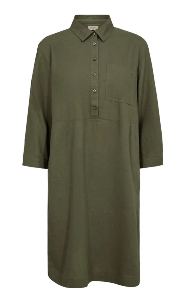 Kjolen har en afslappet pasform med en knaplukning foroven samt én brystlomme.