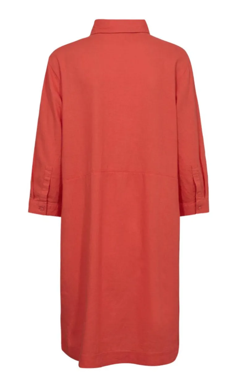Den sødeste hør kjole fra Freequent i en coral farve.