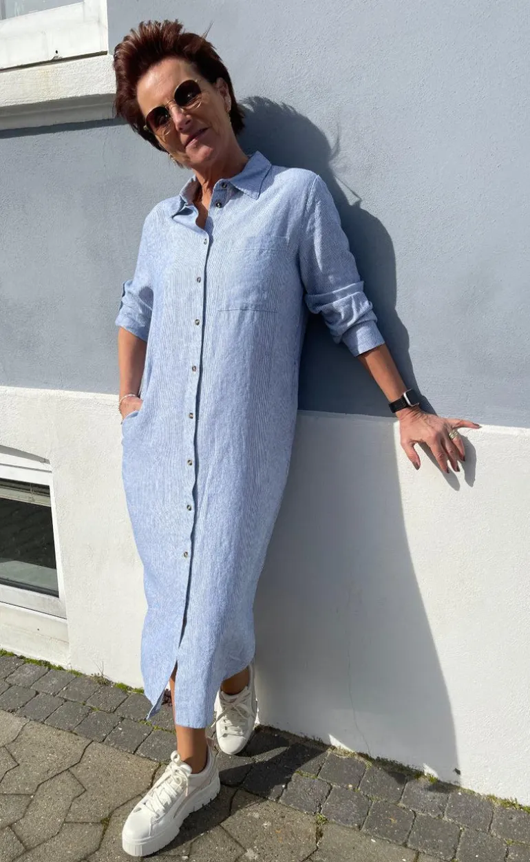 Kjolen har lange ærmer ærmer, gennemgående knapper og én brystlomme.