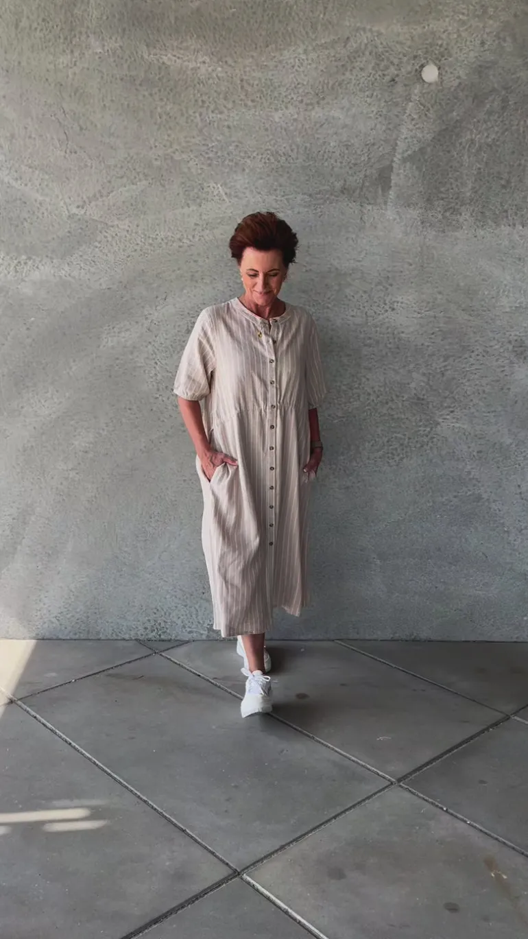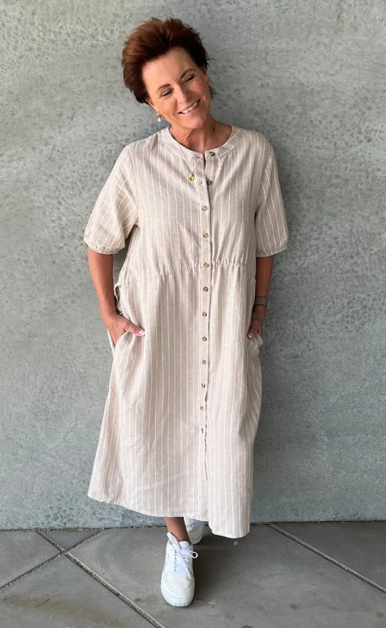 Fin kjole fra Freequent i beige med striber.