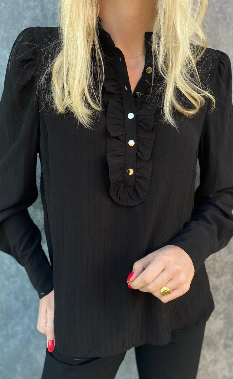 Fin Freequent skjorte i sort med diskrete nålestriber og flæsedetaljer.