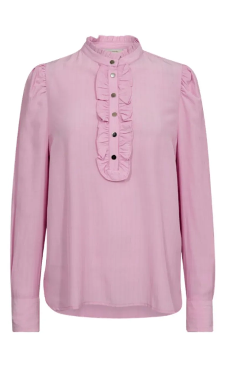 Skjorten har lange ærmer med let puf ved skulderen og en fin stolpeåbning med guld knapper og flæse-detaljer. Der er en fin runding ved bunden, så skjorten har en flot pasform.