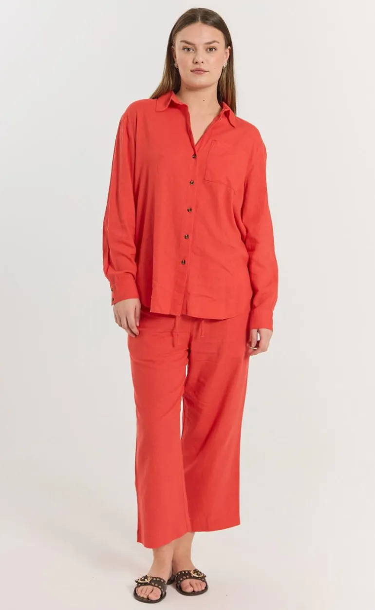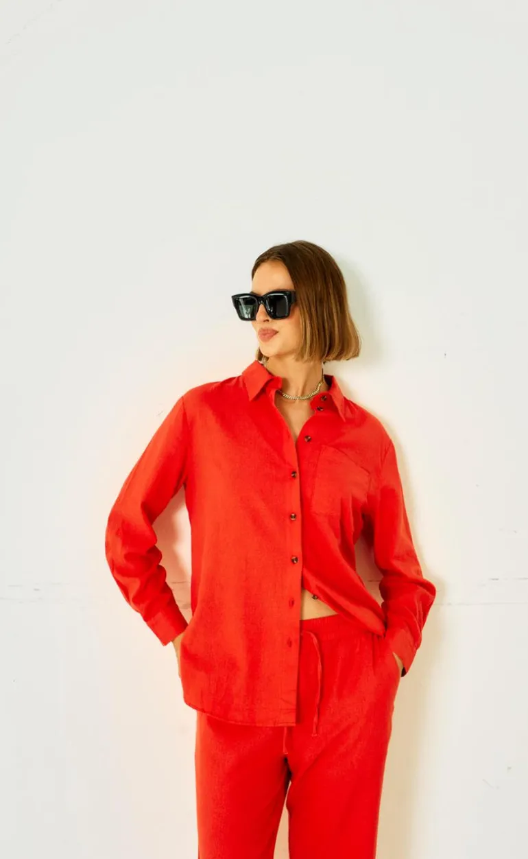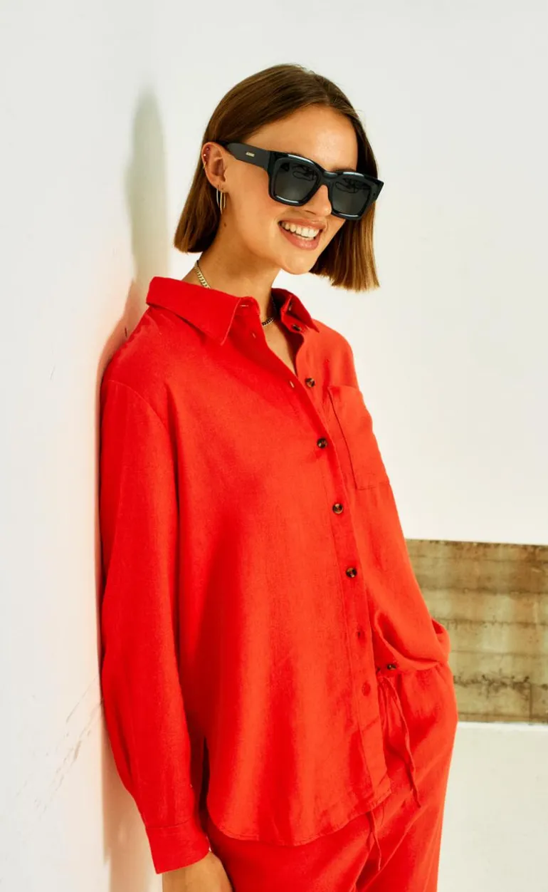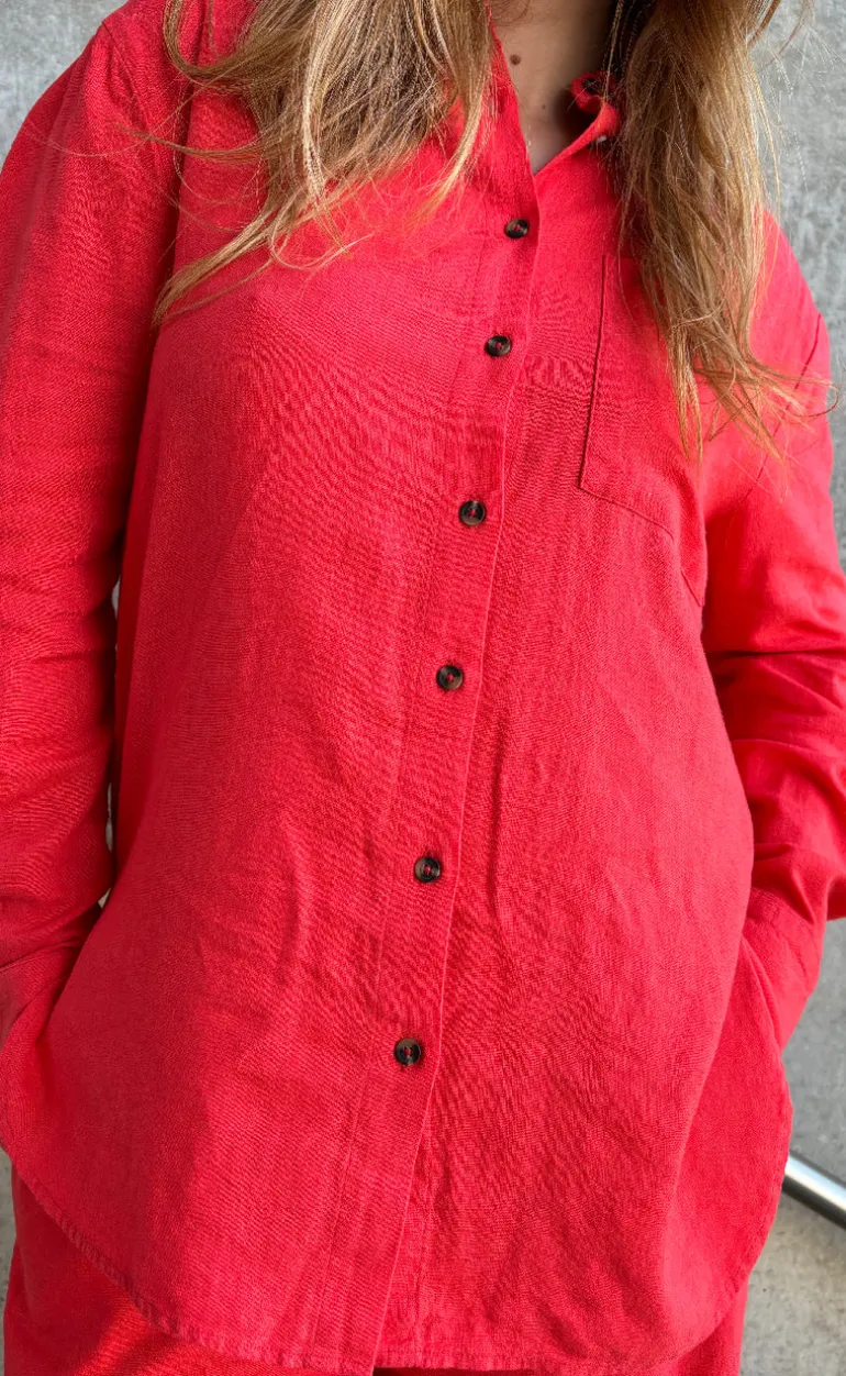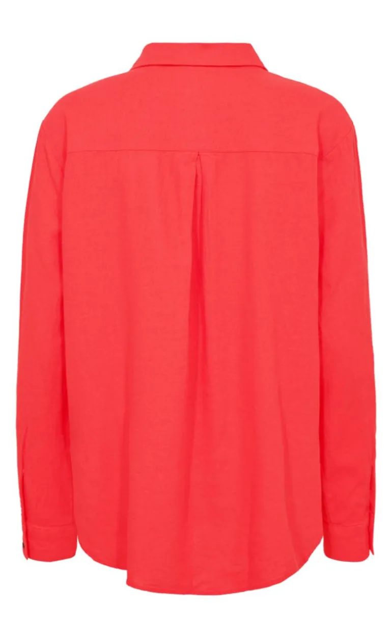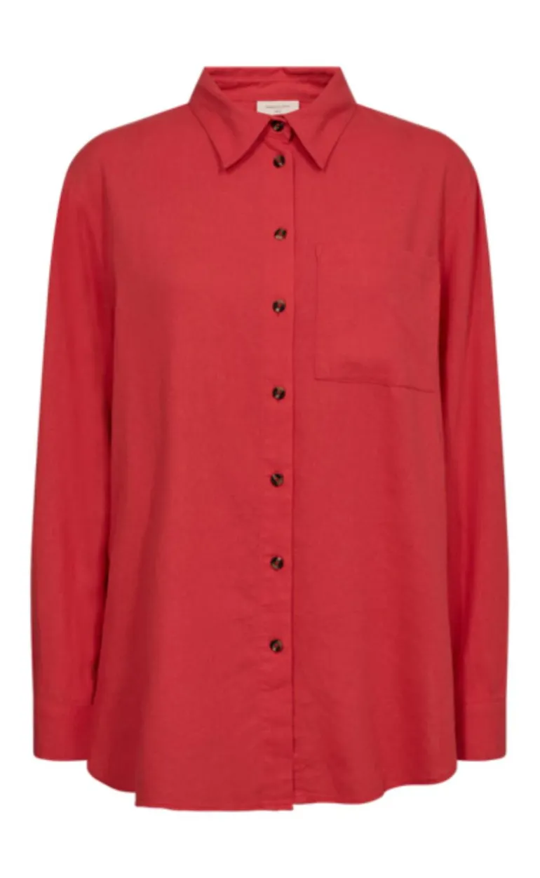 Skjorten har lange ærmer, er gennemknappet, en klassisk skjortekrave samt én brystlomme.