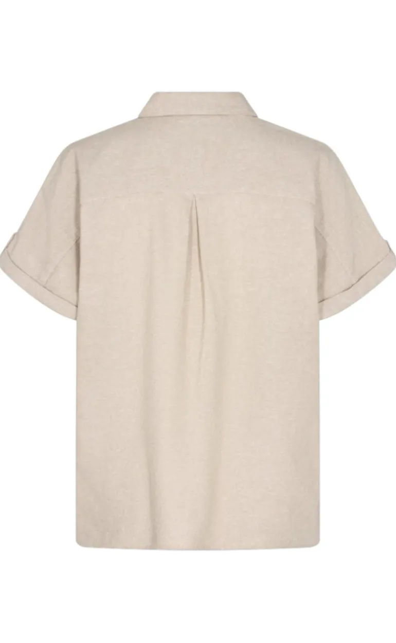 Skjorten har korte ærmer med opsmøgning, er gennemknappet, en klassisk skjortekrave samt en diskret overskæring på ryggen.
