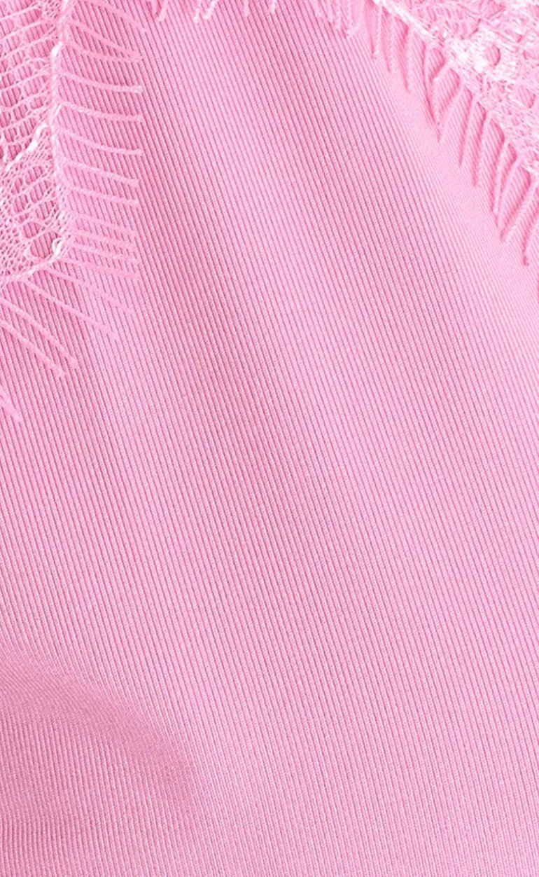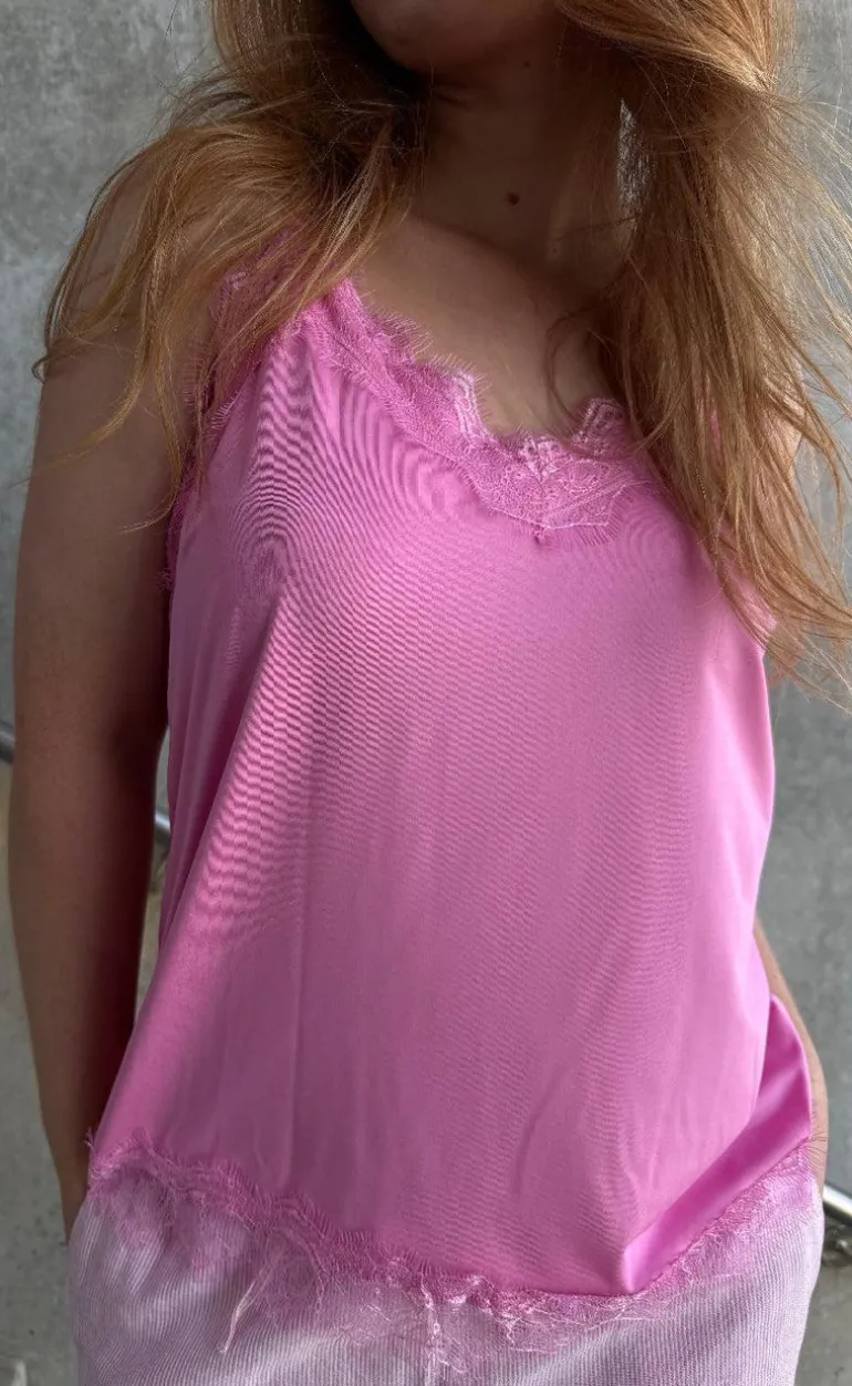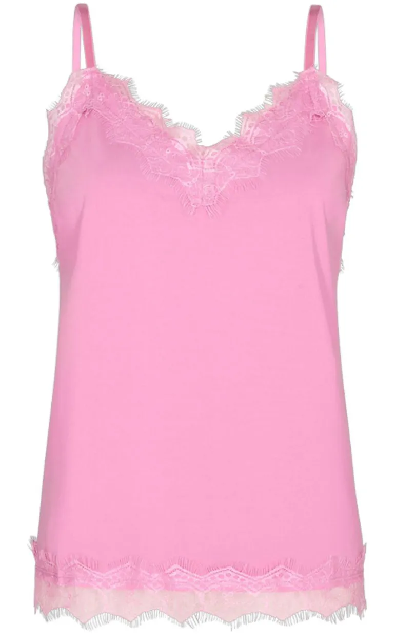 Toppen har v-hals og justerbare stropper, så den kan tilpasses efter behov. Der er blonder ved halsen og i bunden af toppen.