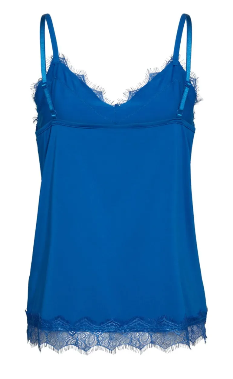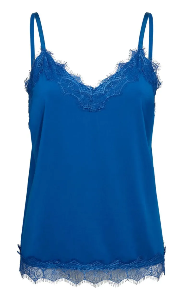 Toppen har v-hals og justerbare stropper, så den kan tilpasses efter behov. Der er blonder ved halsen og i bunden af toppen.