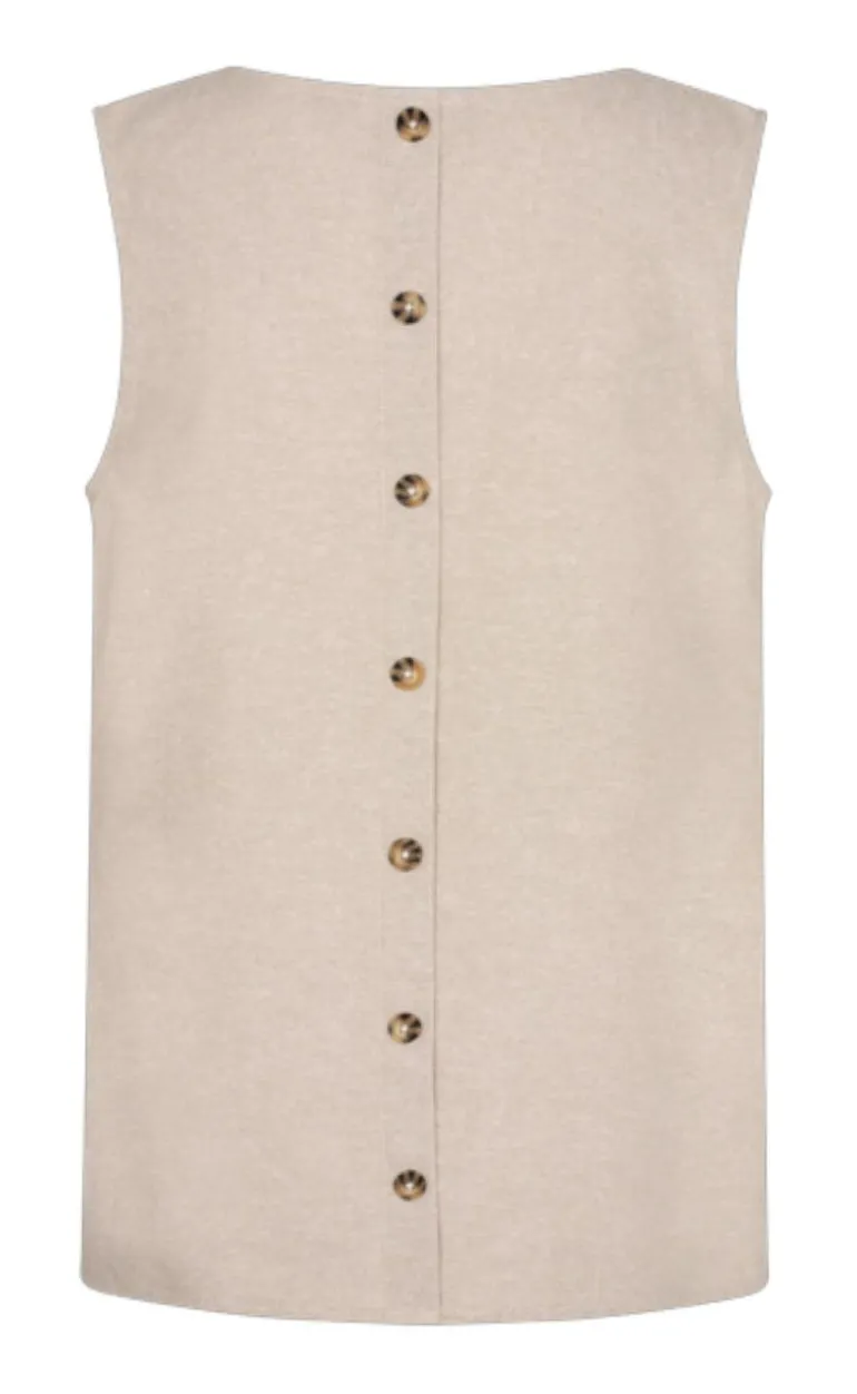 Toppen er ærmeløs og har en rund halsudskæring. Desuden har toppen knapper på ryggen.