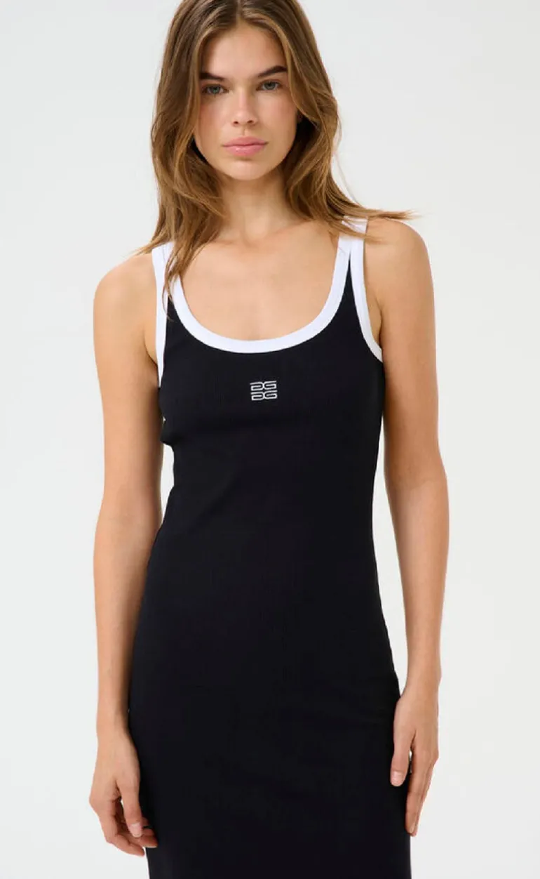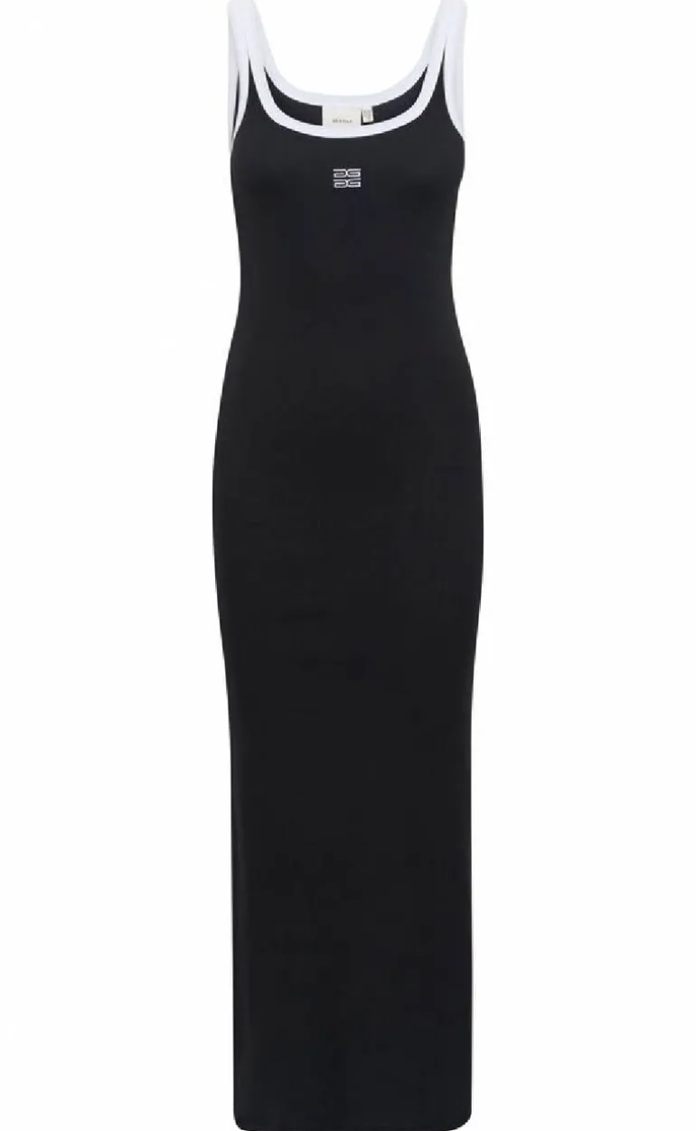 Tætsiddende maxi kjole fra Gestuz i sort med hvide kontrast sygninger, i en ribbet kvalitet.