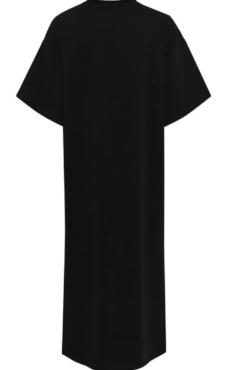 Afslappet kjole fra Gestuz i sort med hvid print fortil.