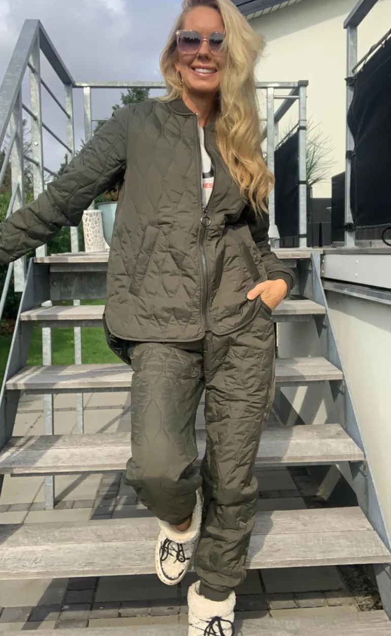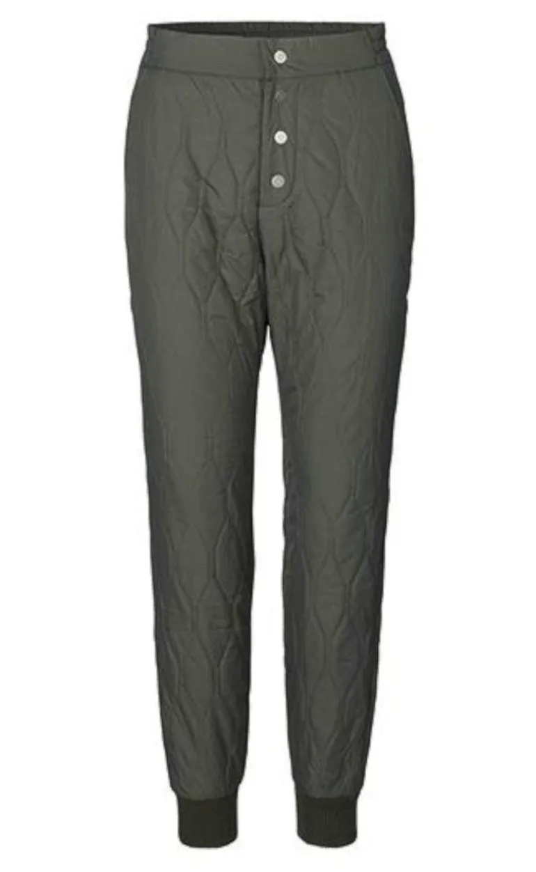 Bukserne er lavet i et lækkert quiltet materiale, har knappelukning, sidelommer og elastik forneden.