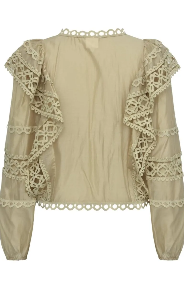 Bluse har mangen smukke detaljer og kan lukkes med en sløjfe.