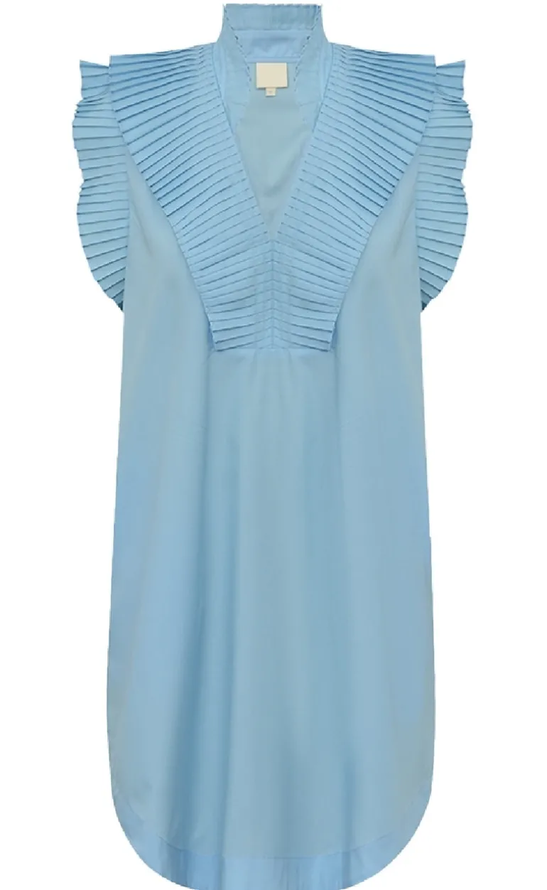 Kjolen har en A-shape fit med dyb V-neck og med de smukkeste plisse flæser i krave, hals og ærmegab.