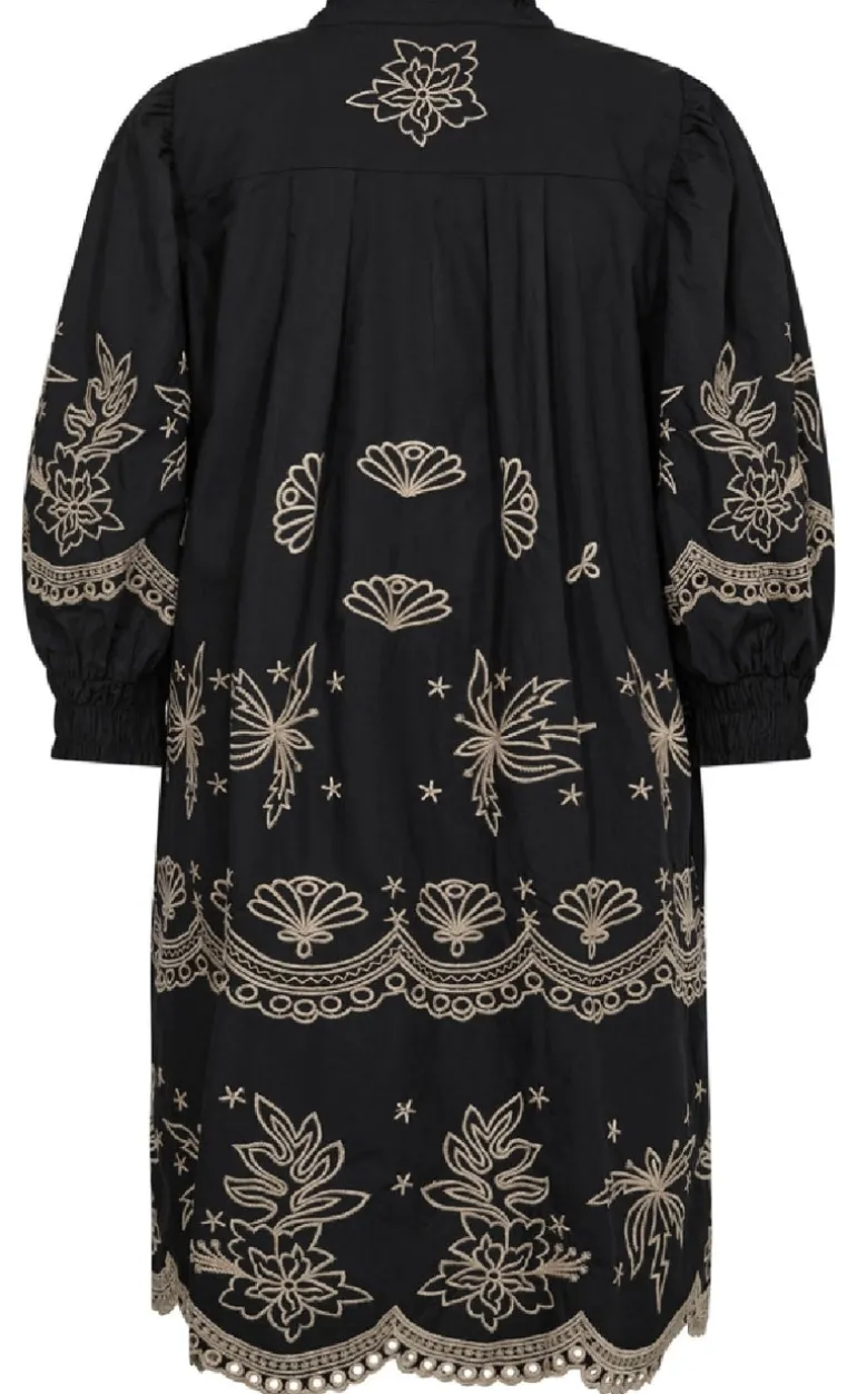Fin kjole fra Gossia i sort med brune broderi anglaise detaljer.