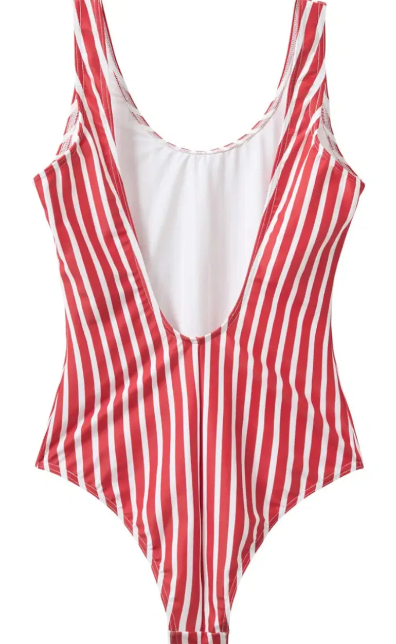 Badedragten har striber samt en åben ryg.