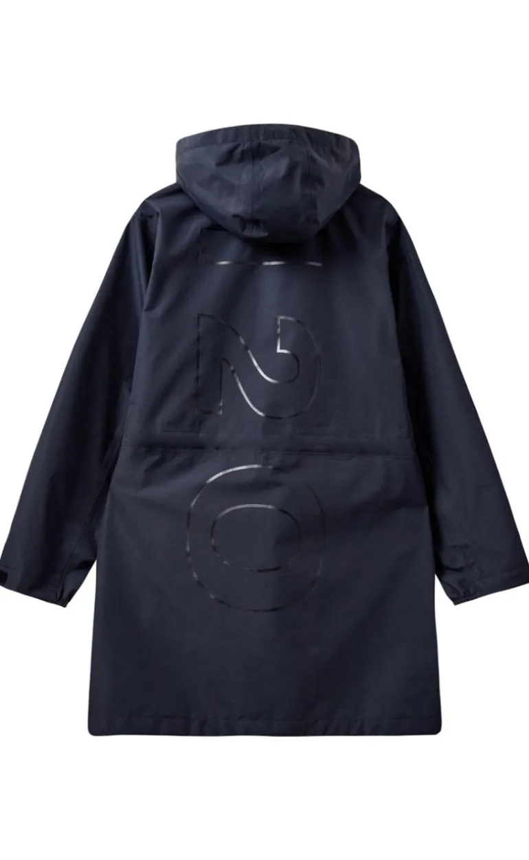 Regnjakken er en lang model med justbar hætte, sidelommer med magnetlukning og en skjult knaplukning.