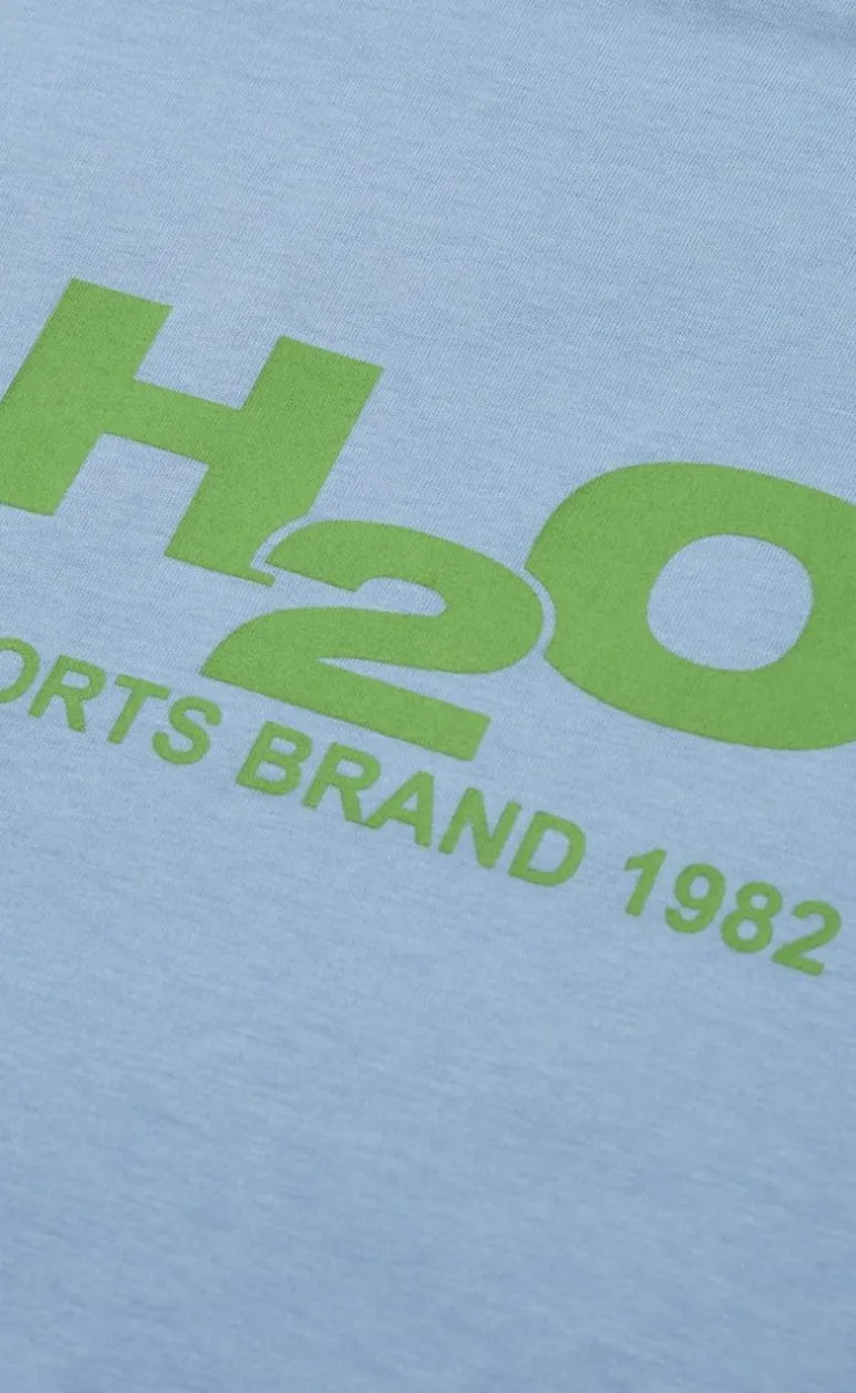 Flot og basic t-shirt fra H2O i lyseblå med det klassiske “H2O” logo fortil, i lysegrøn.