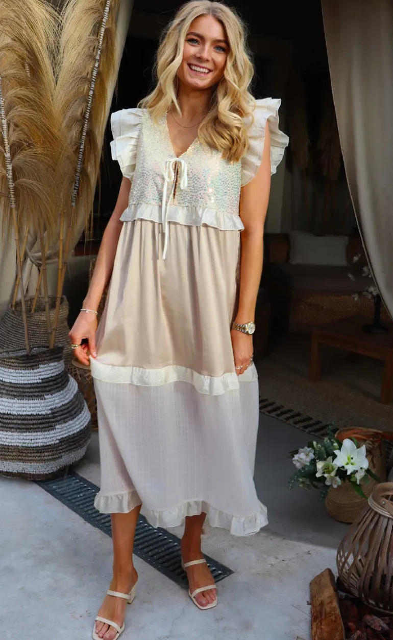 Festlig kjole fra Liberte i tre forskellige nuancer, med flæsekanter hos ærmerne, palietter og en finde bindedetalje fortil.