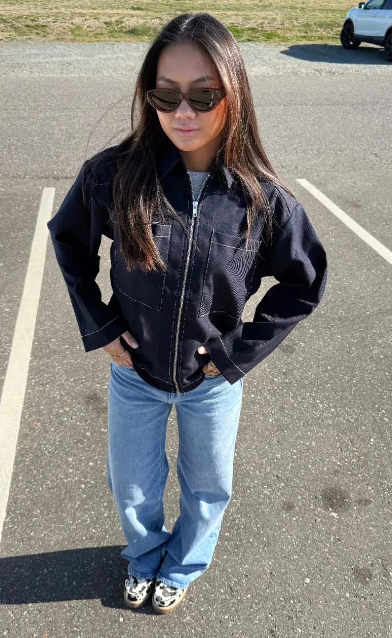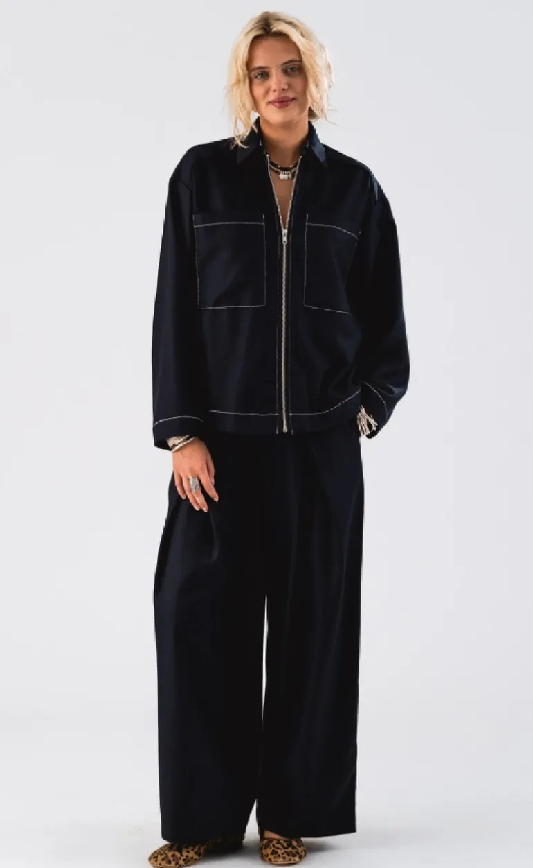 Flot jakke fra Lollys Laundry i mørkeblå, med hvide kontrast sygninger.