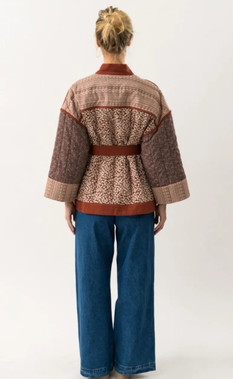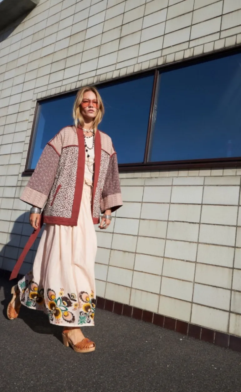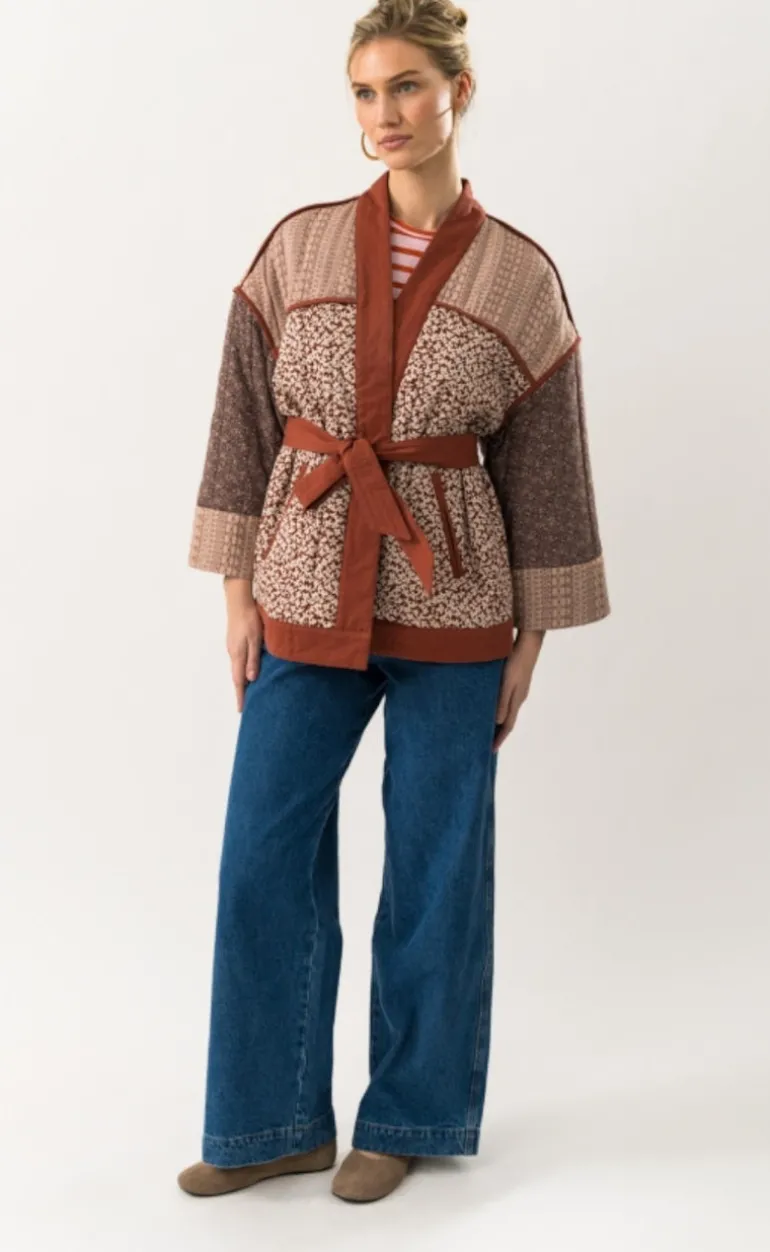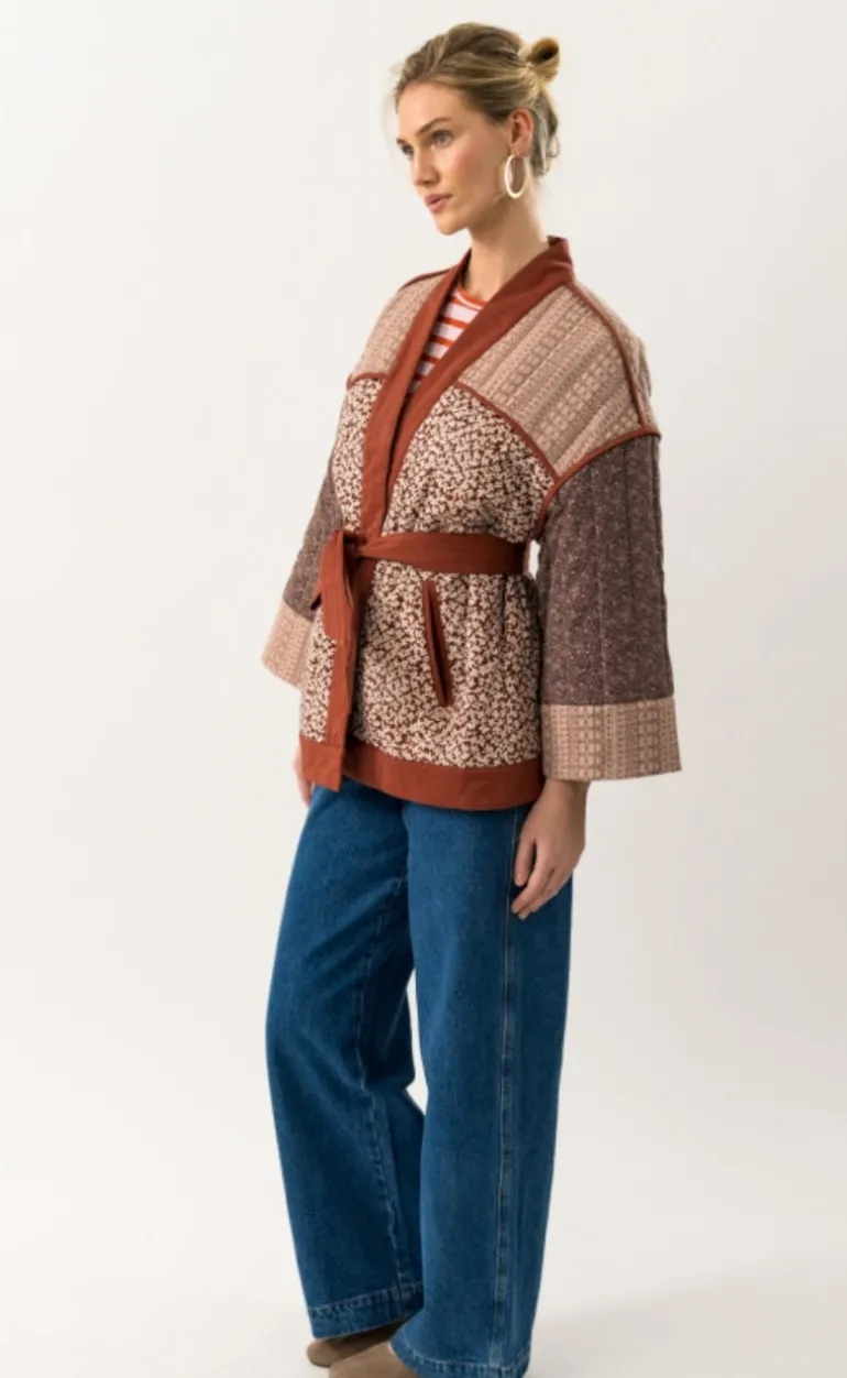 Jakken har brede ærmer og bånd i taljen.