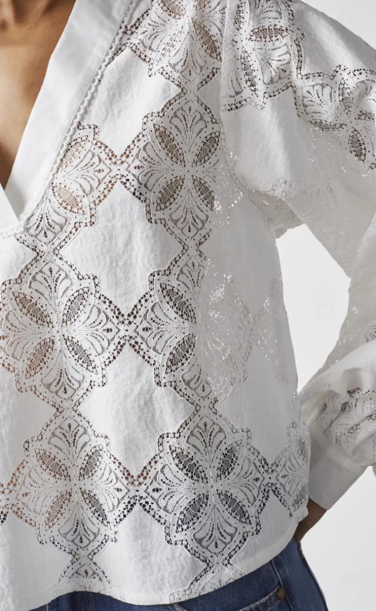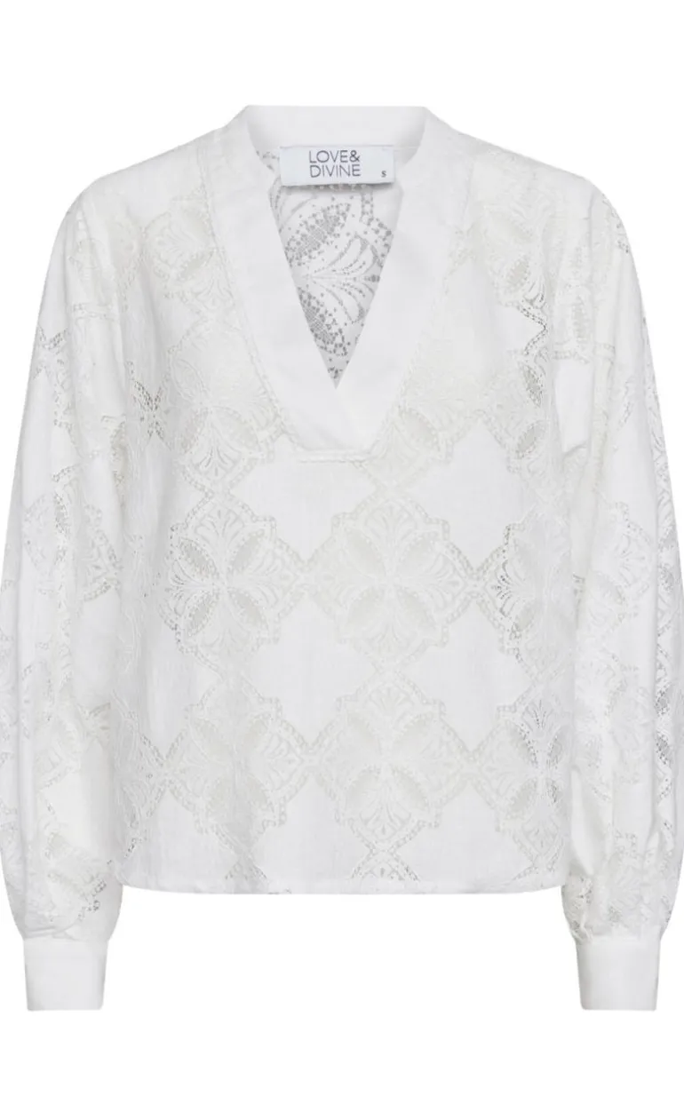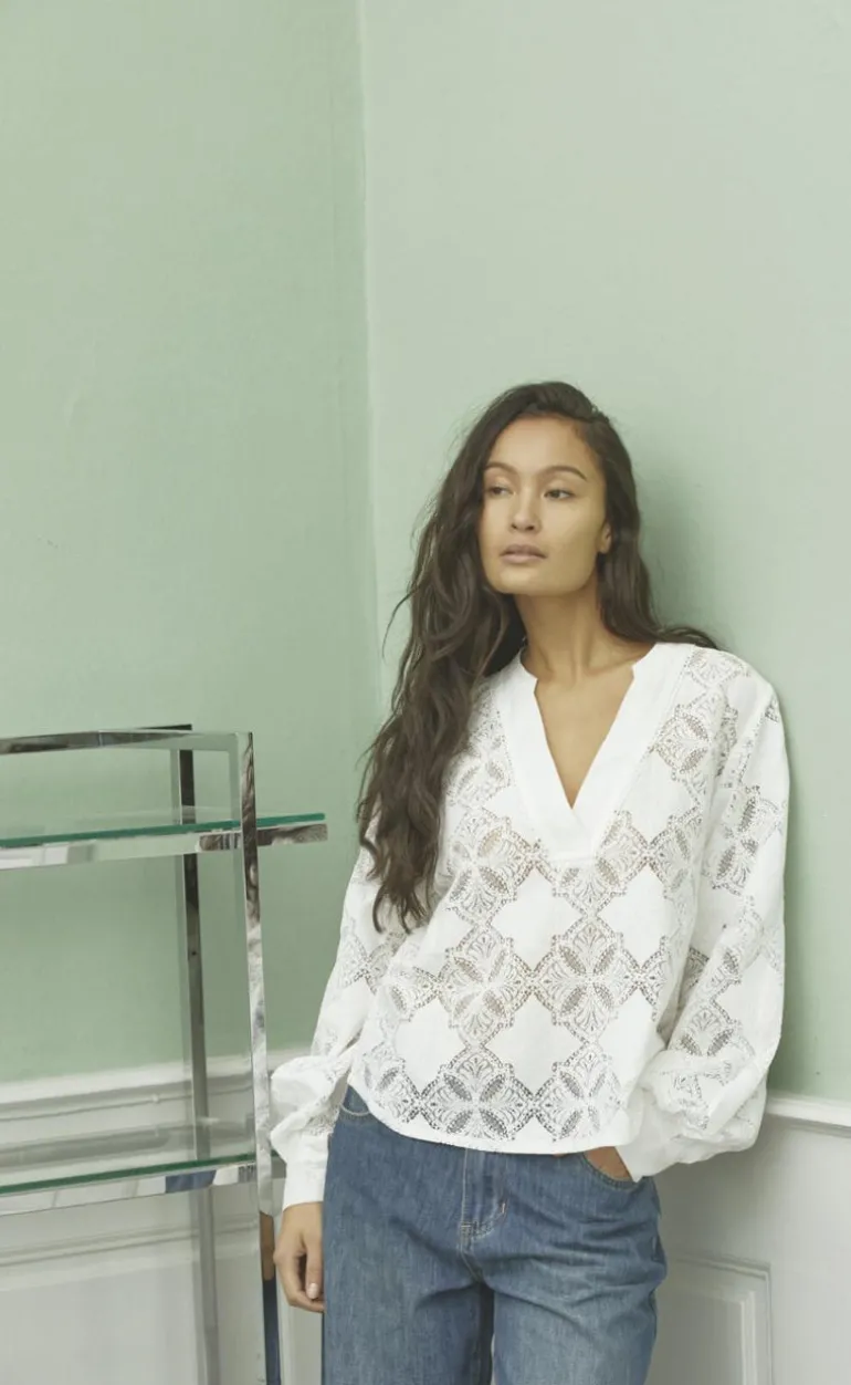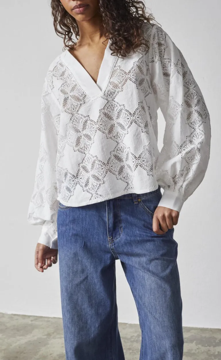 Blusen har en afslappet pasform med let puffærme og en dyb v-udskæring