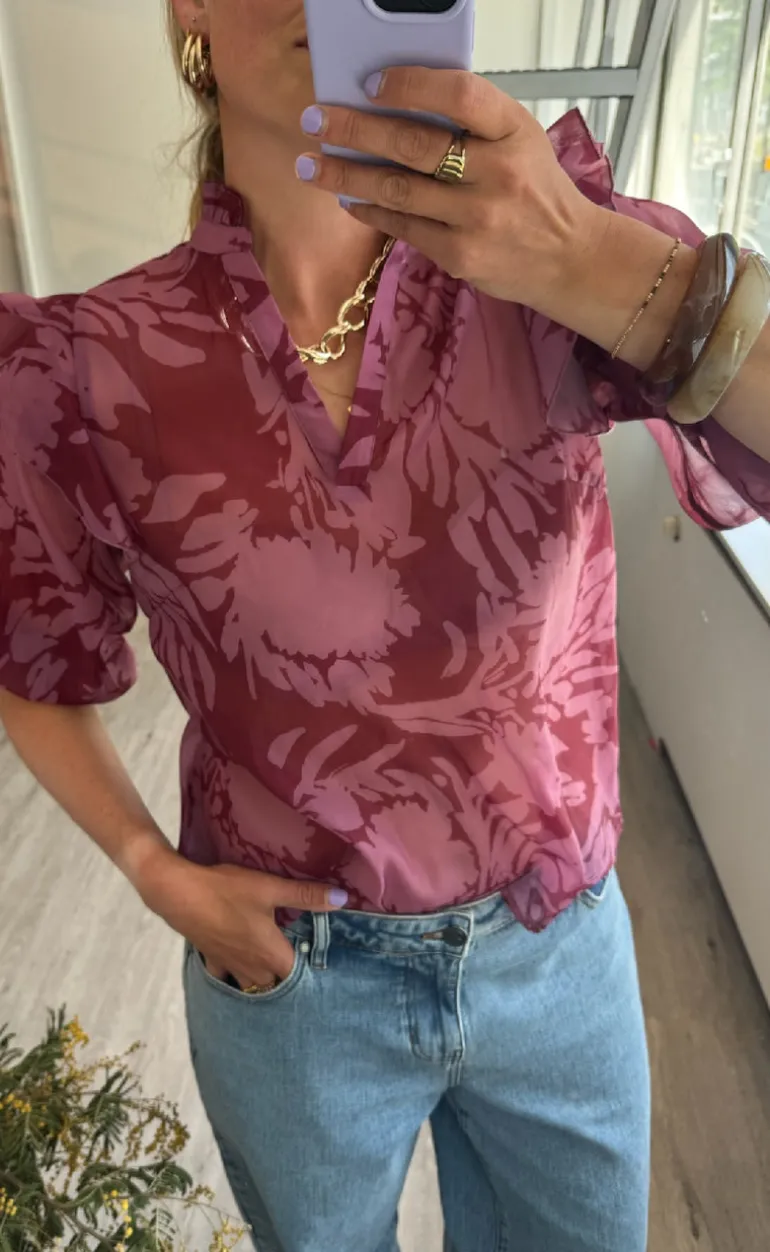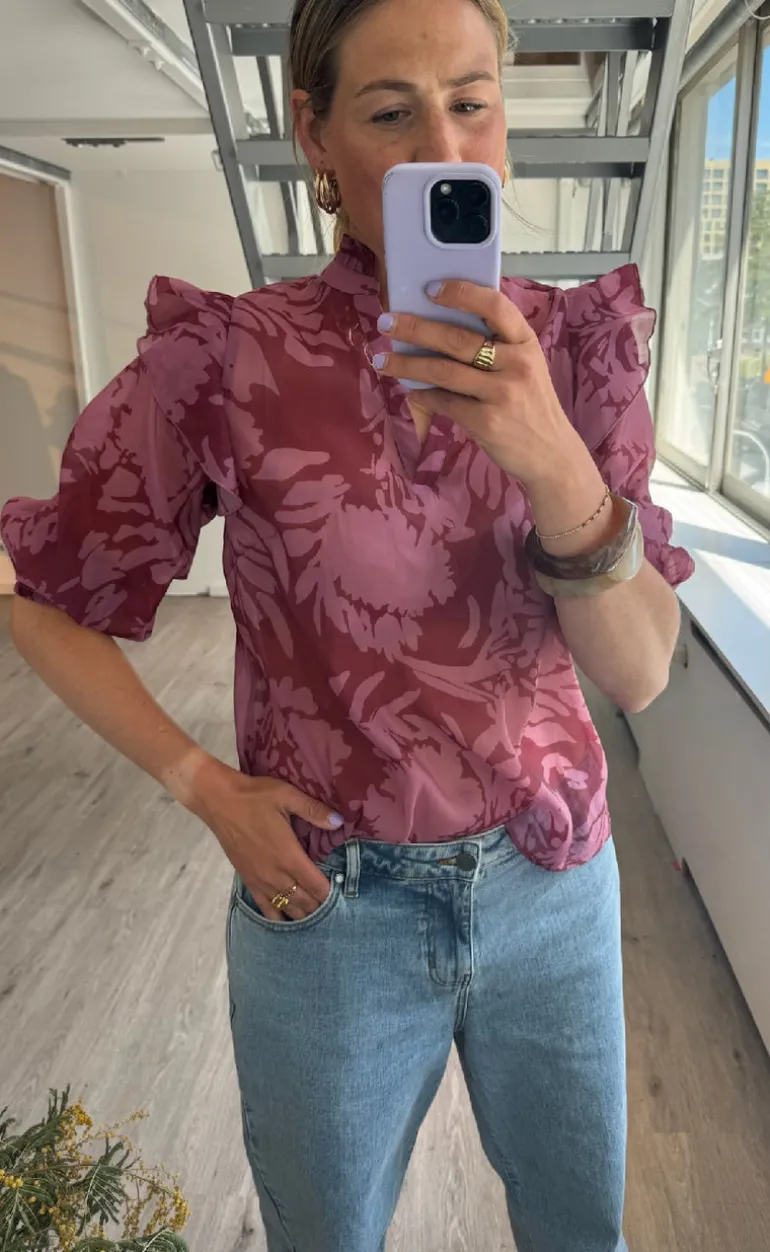 Fineste bluse fra Love & Divine med smukt print og flæsedetaljer ved skulderen