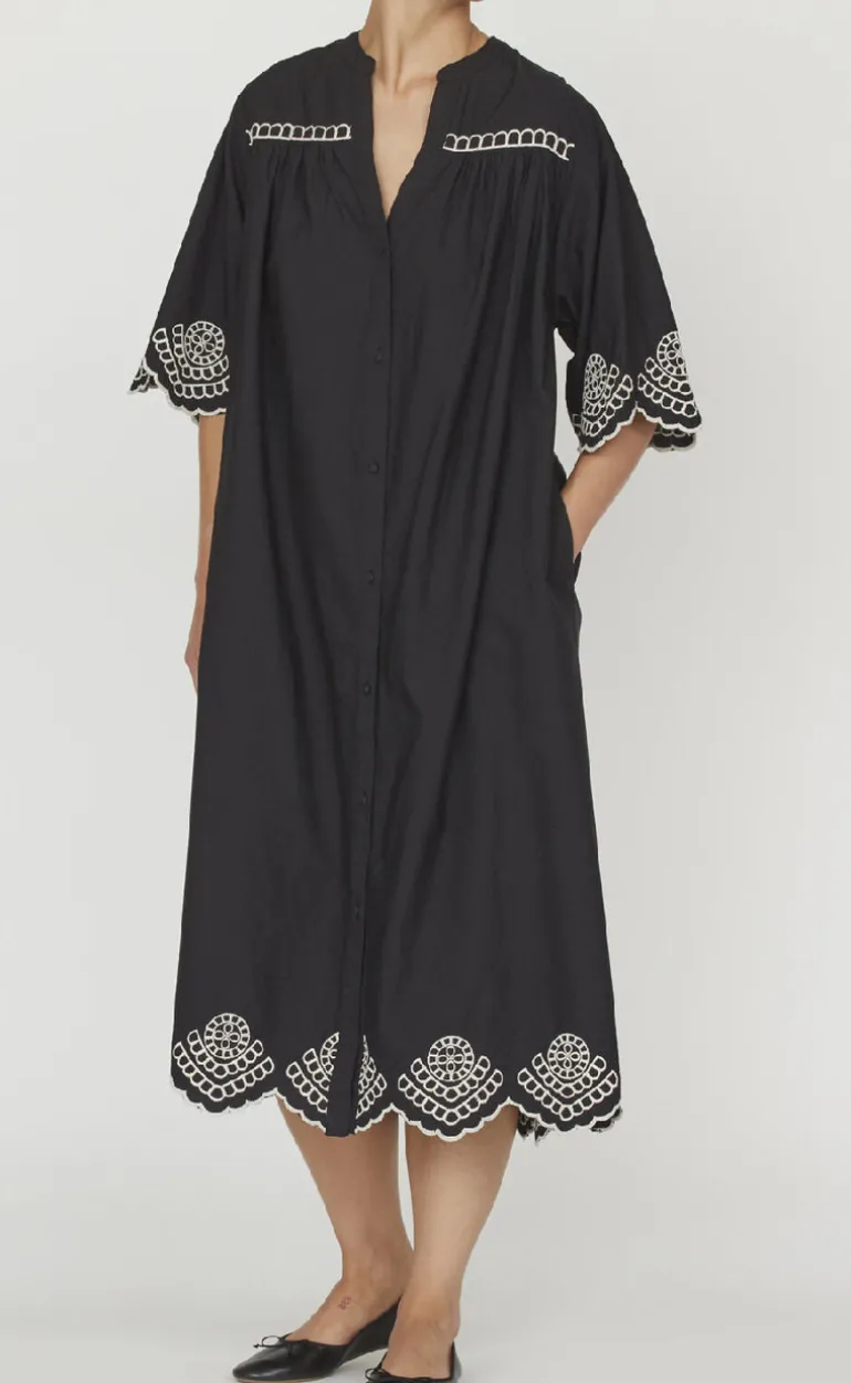 Lang sort skjortekjole fra Love & Divine med et hvidt hulmønster.
