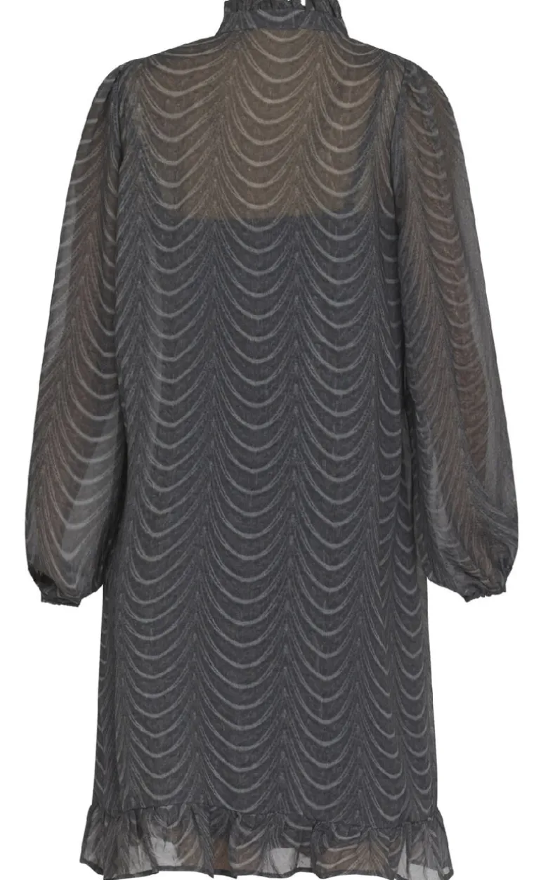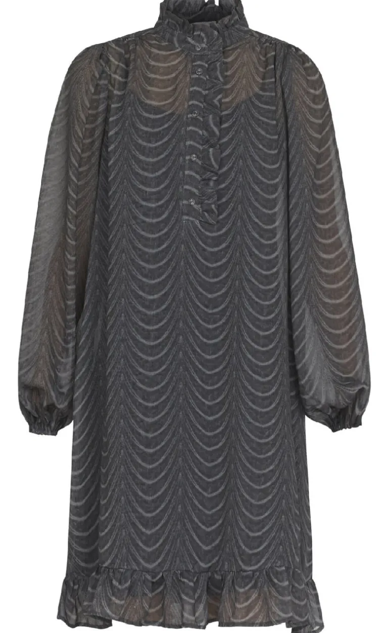 Feminin lang og løstsiddende kjole fra Love & Divine i et mørkegrå mønster.