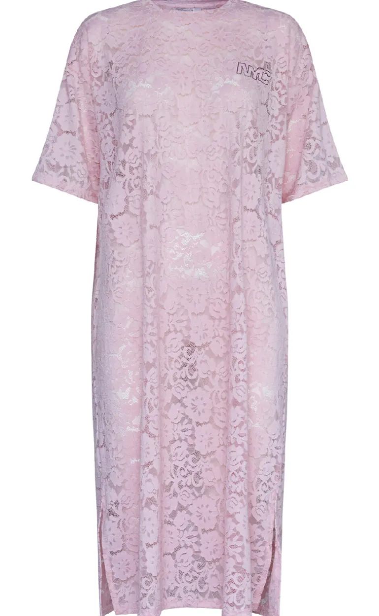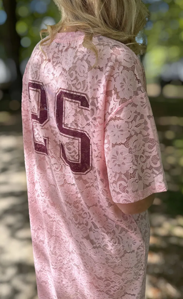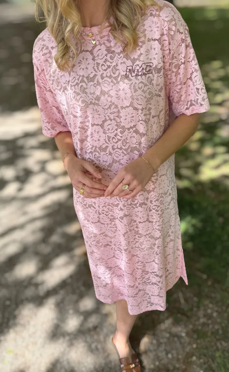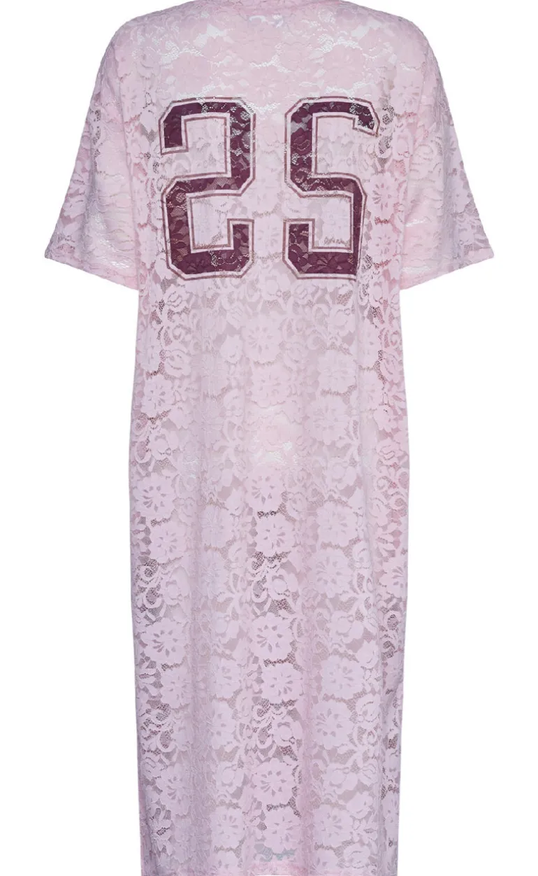 Denne kjole er lyserød og har en masse blonder.