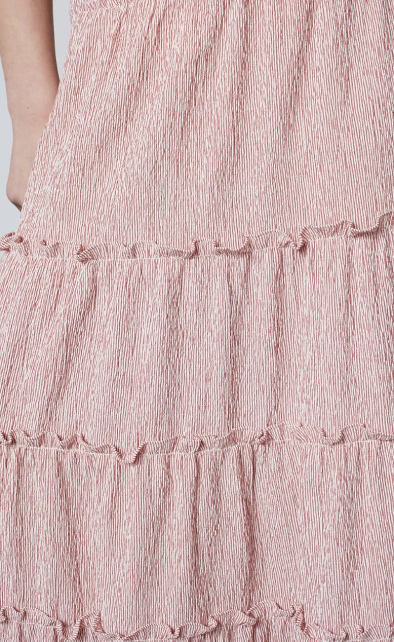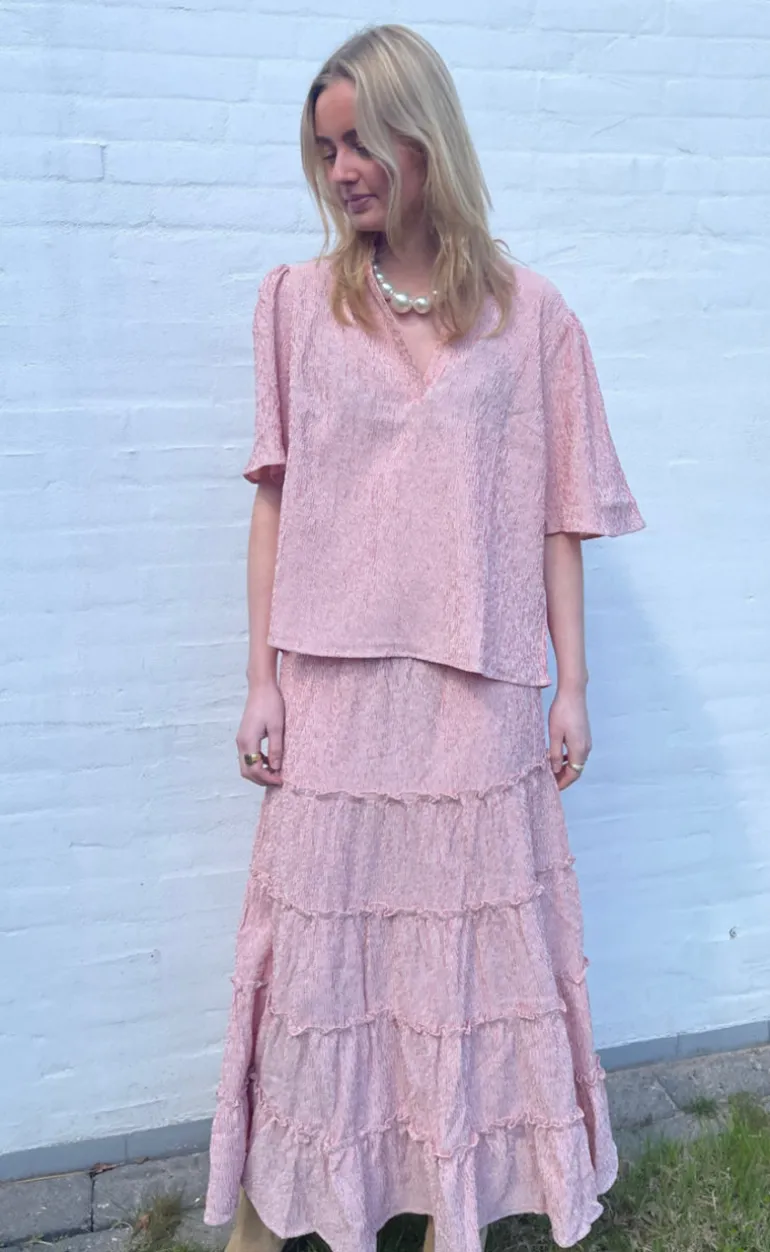 Nederdelen er lang med flæse detaljer.