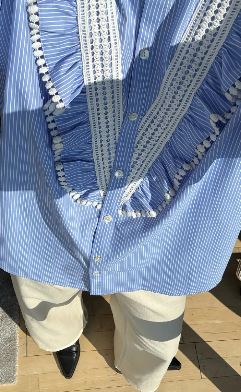 Skjorten har mange smukke detaljer, er gennemknappet og har blondedetaljer.