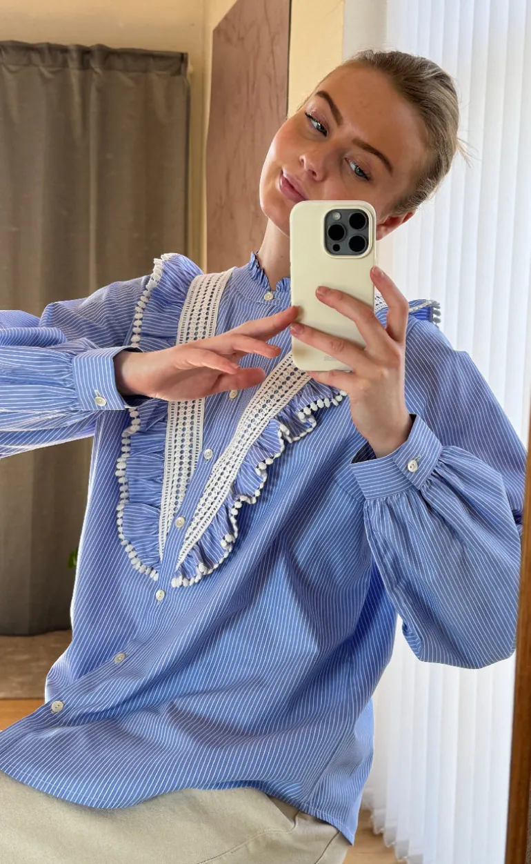 Feminin skjorte fra Love & Divine i blå og hvide nuancer.
